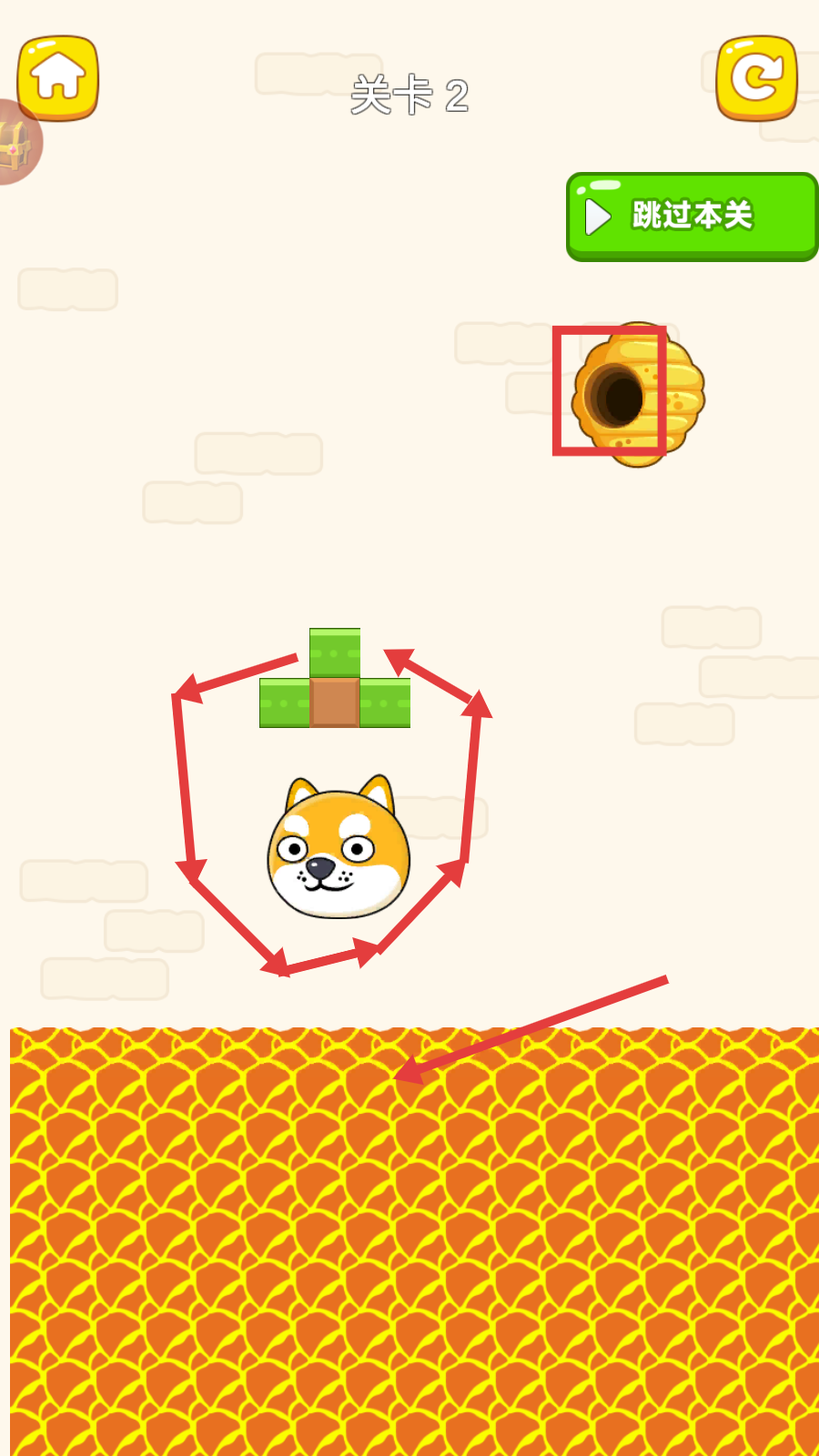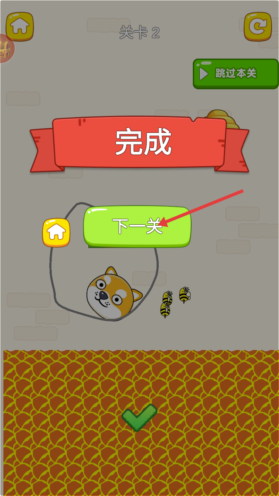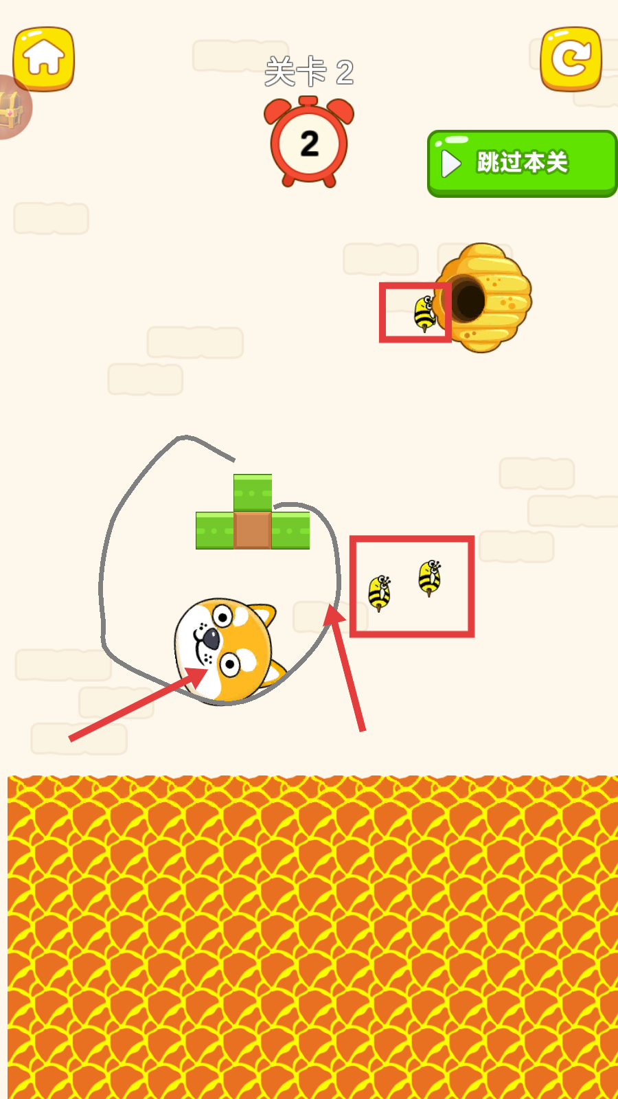 2、在【关卡2】中,观察柴犬、蜂巢与下方危险区域,规划画线路径,保护柴犬不被伤害,推进解谜进程。