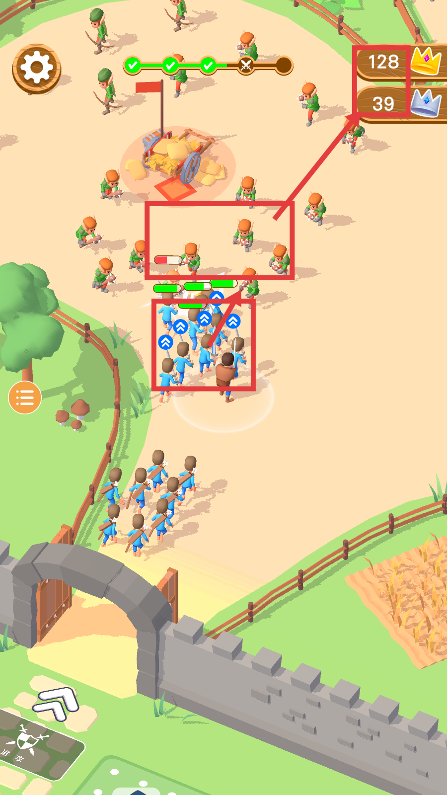 2、战斗阶段,指挥士兵部队进攻敌方,关注双方资源(皇冠、银冠数量),利用兵力优势推进,在战斗中提升士兵战力,逐步占领敌方区域。