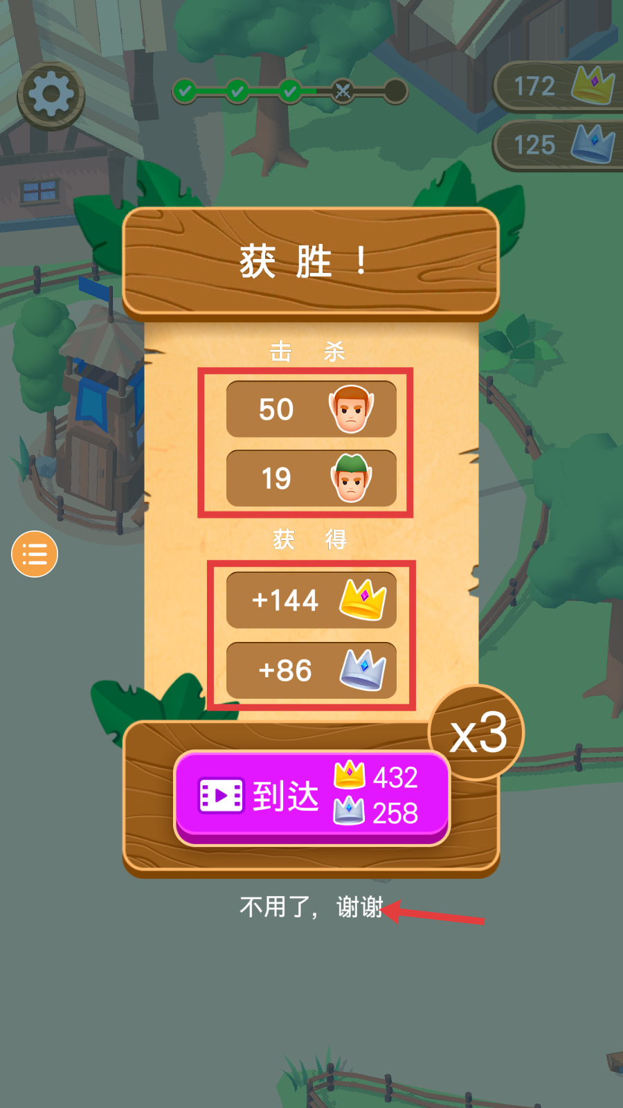 4、获胜后获得击杀数和资源奖励,可选择“不用了,谢谢”或翻倍奖励,积累资源继续挑战新关卡,提升整体战力与领地等级。