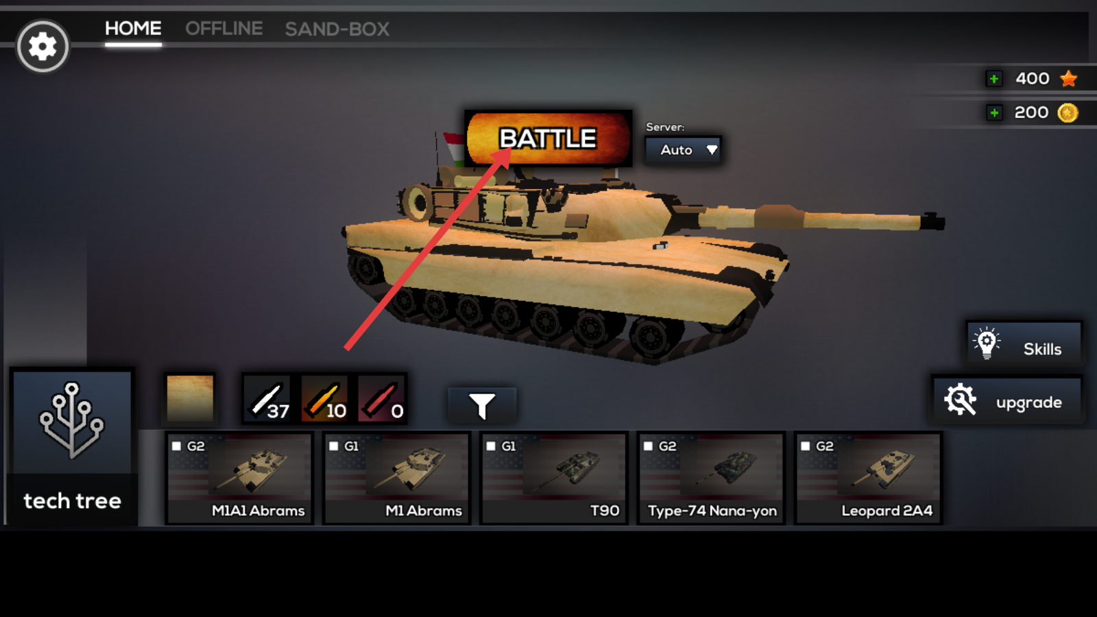 1、进入游戏点击【BATTLE】按钮,选择坦克开启战斗,为作战做好准备。