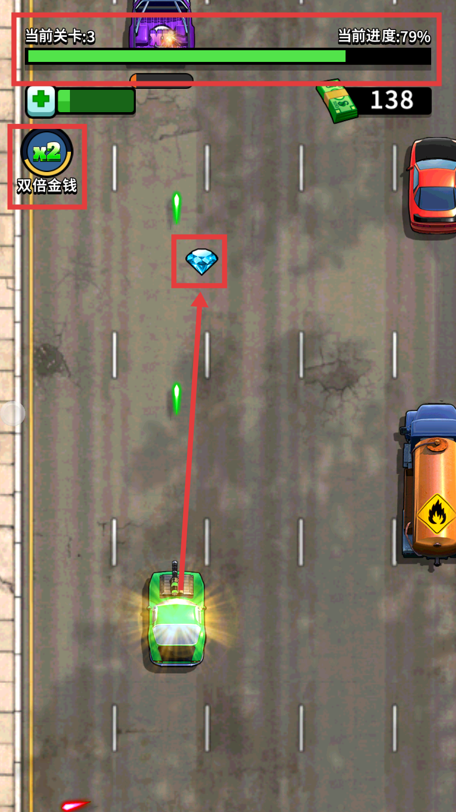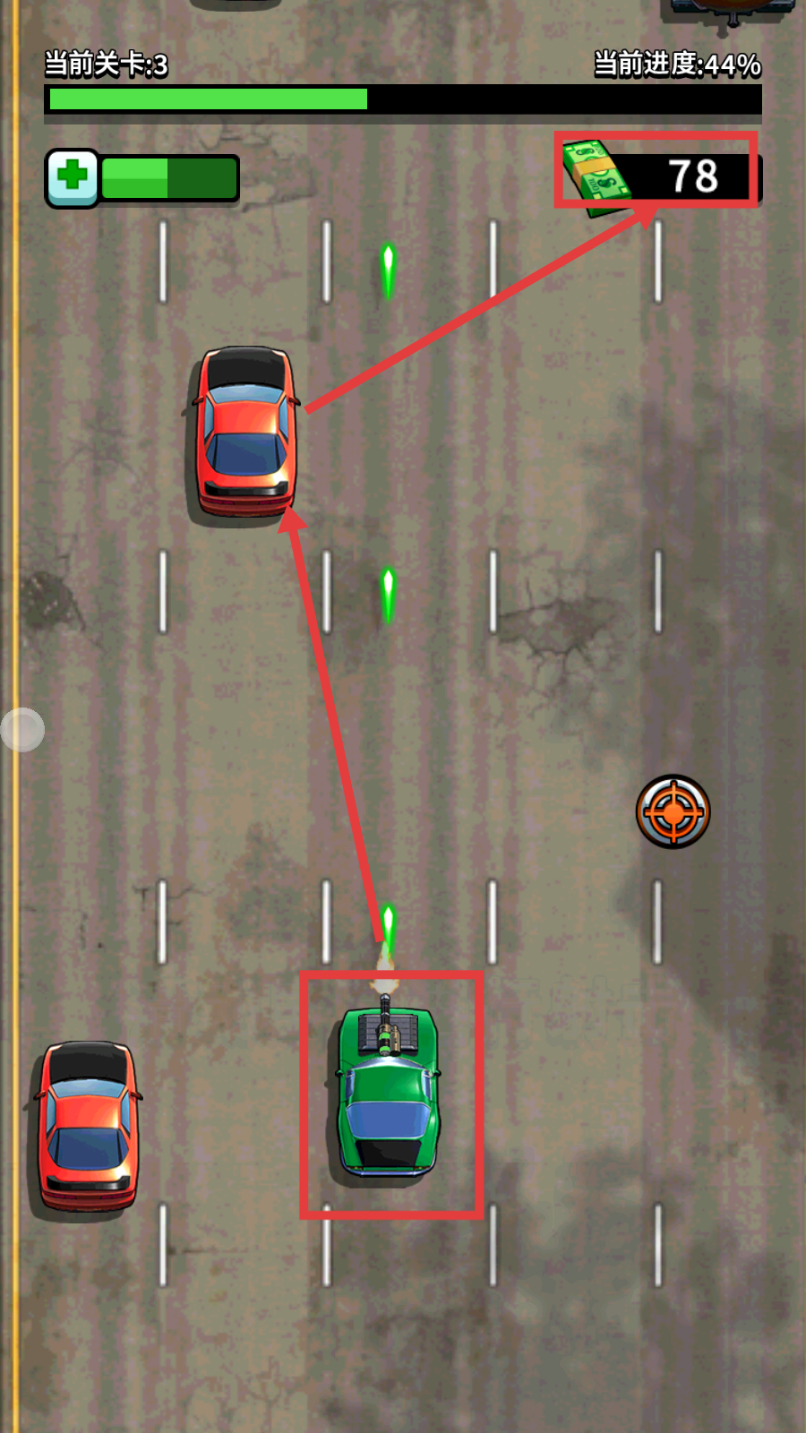 2、当前关卡3战斗中,操控绿色汽车攻击红色汽车,同时收集金钱,积累资源。
