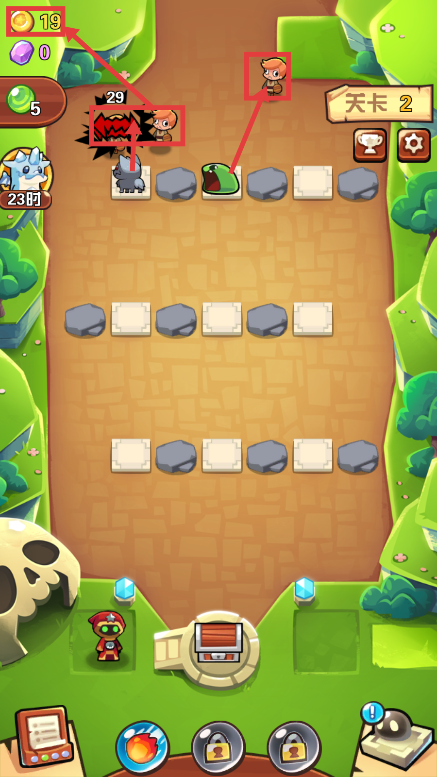 3、在【关卡2】中,操控怪物攻击敌人,积累【19金币】,推进战斗进度,获取资源。