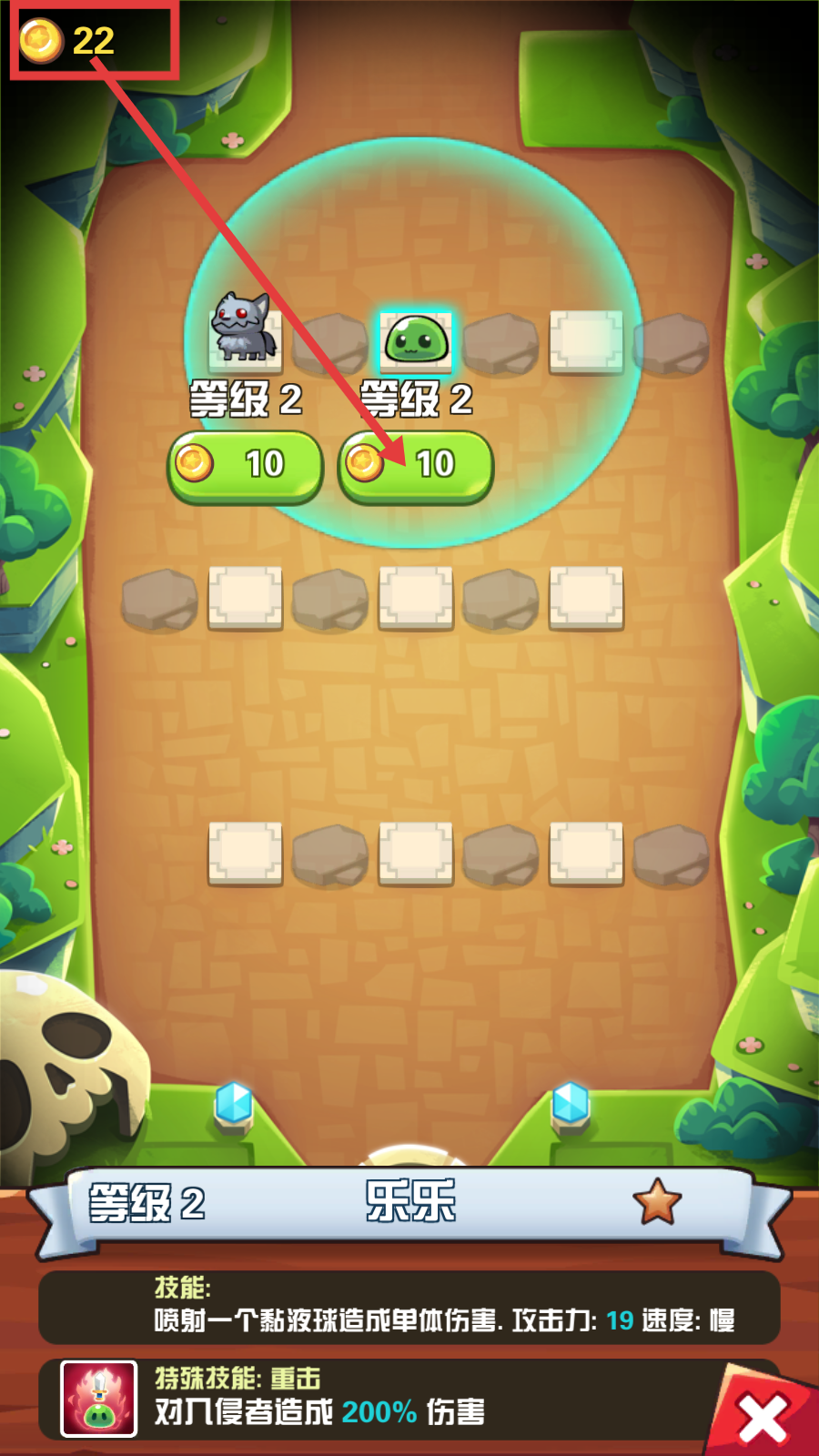 4、消耗金币升级【等级2-怪物】,提升其攻击力,助力后续关卡战斗,强化防御能力。