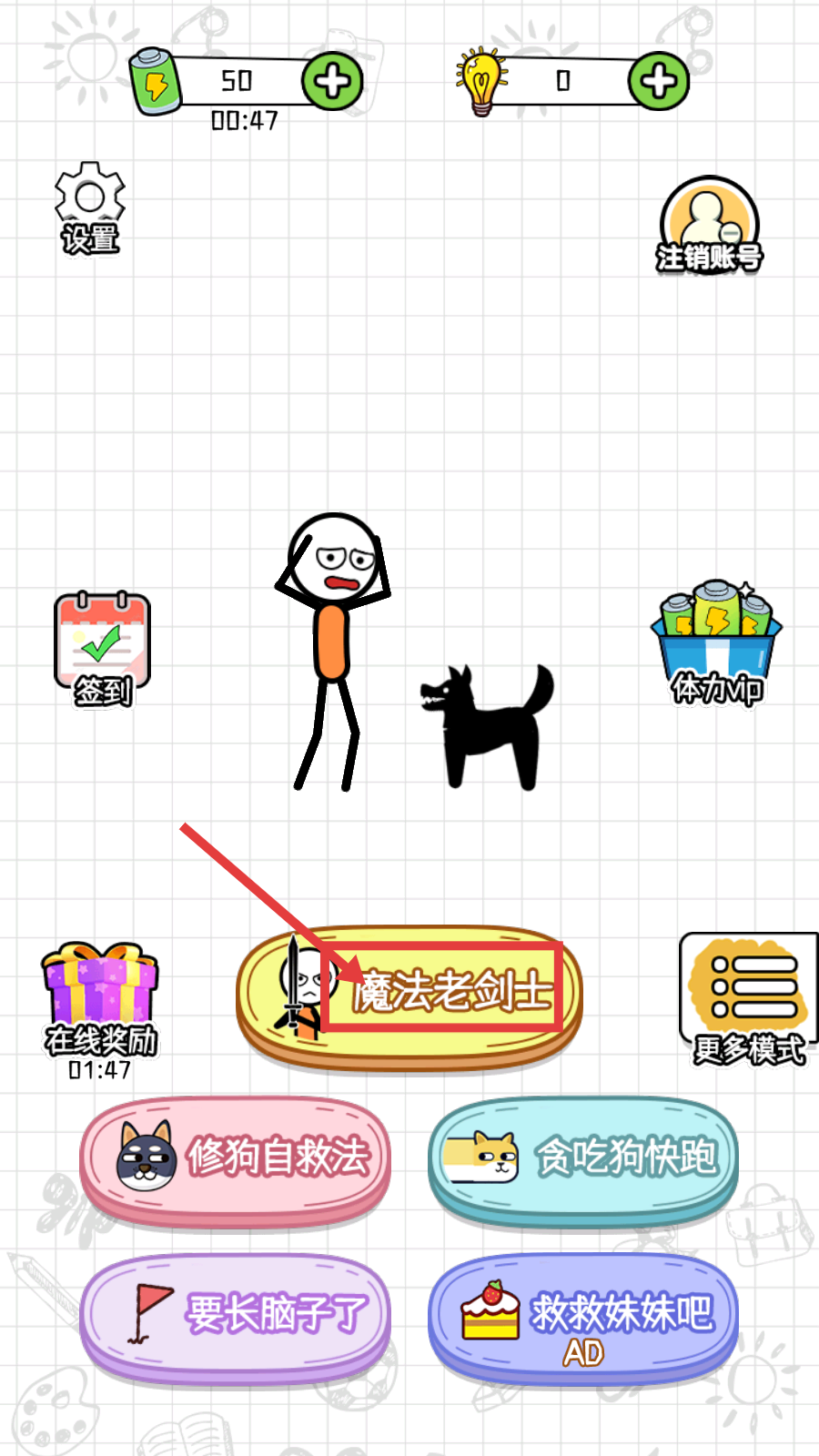 1、点击【魔法老剑士】,进入游戏模式,开启【第1关-画剑攻击对手】的挑战,准备学习画剑攻击技巧。