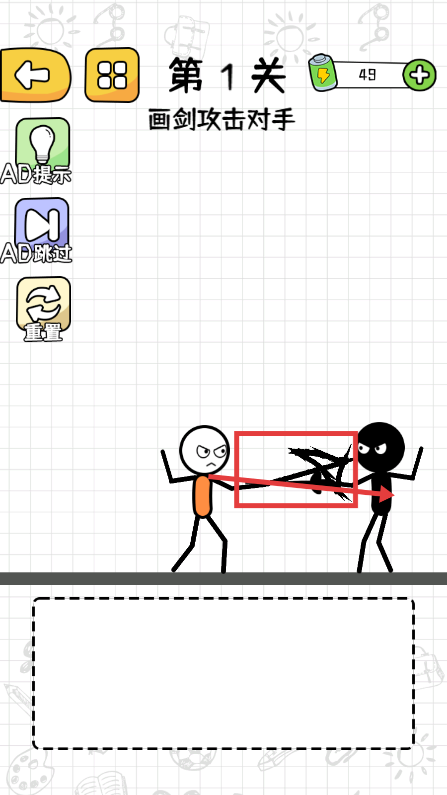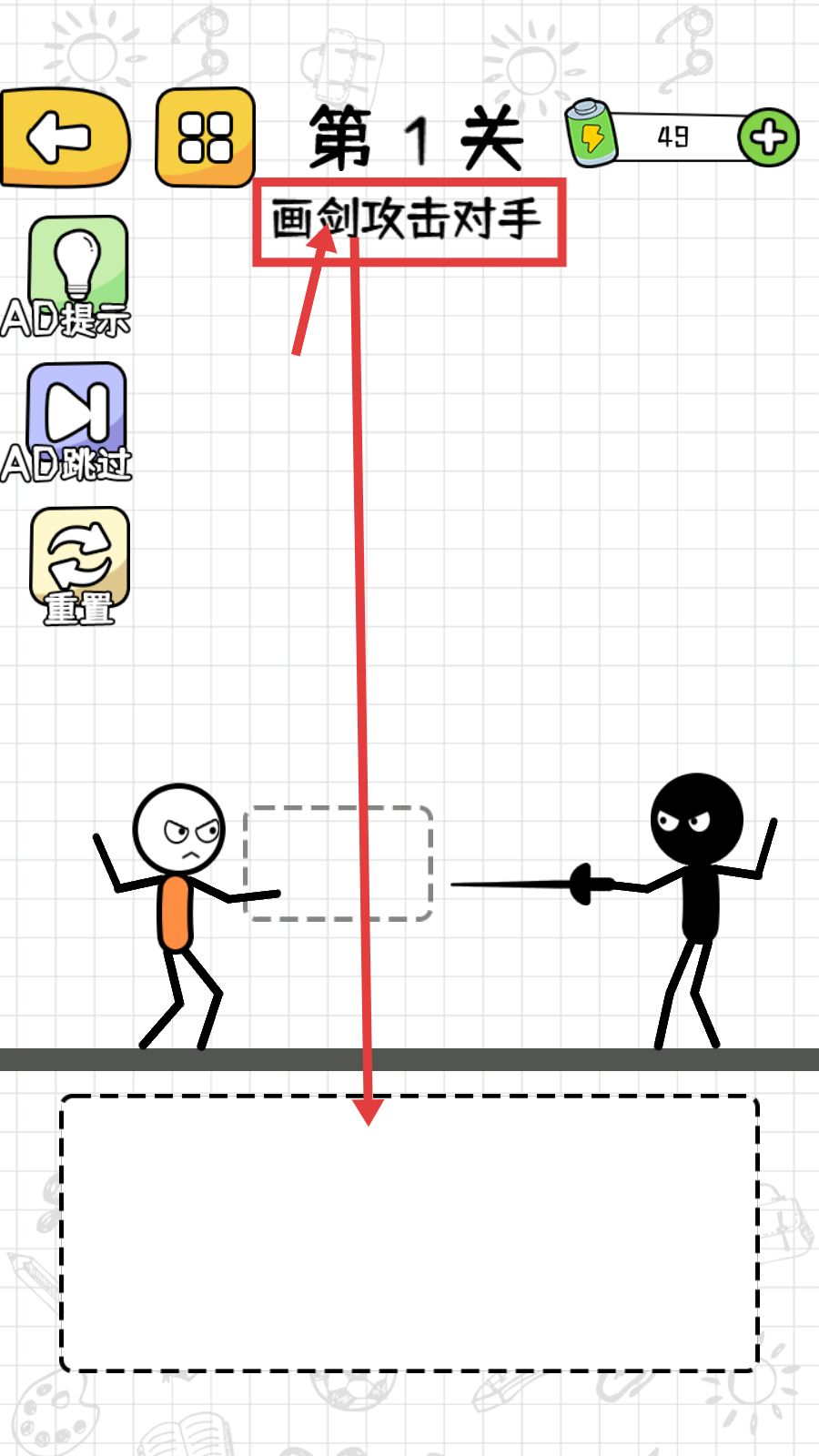 2、在【第1关-画剑攻击对手】中,按照提示在下方区域画剑,目标是攻击黑色对手,掌握画剑攻击的操作方法。