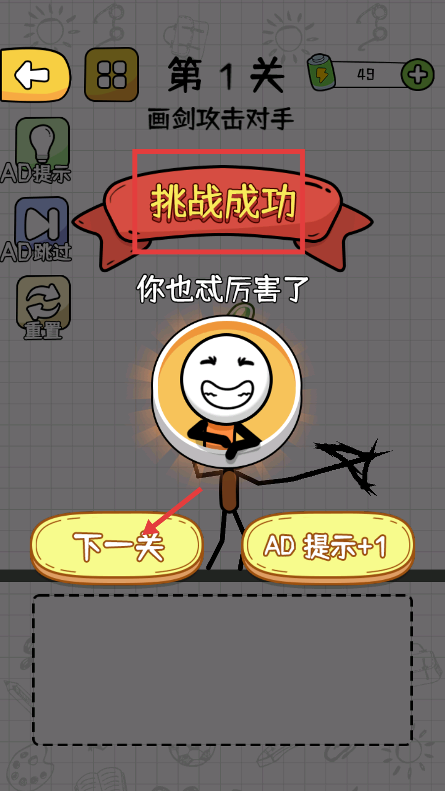 4、挑战成功后,点击【下一关】,继续挑战后续关卡,积累游戏进度,提升画剑攻击的技巧。