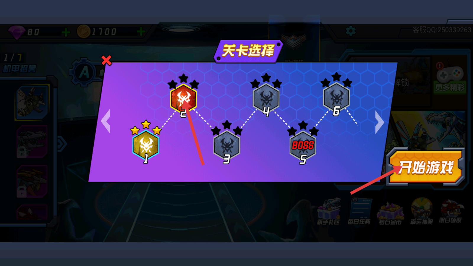 1、选择【关卡2】后,点击【开始游戏】,开启机甲战斗挑战,准备应对敌人。