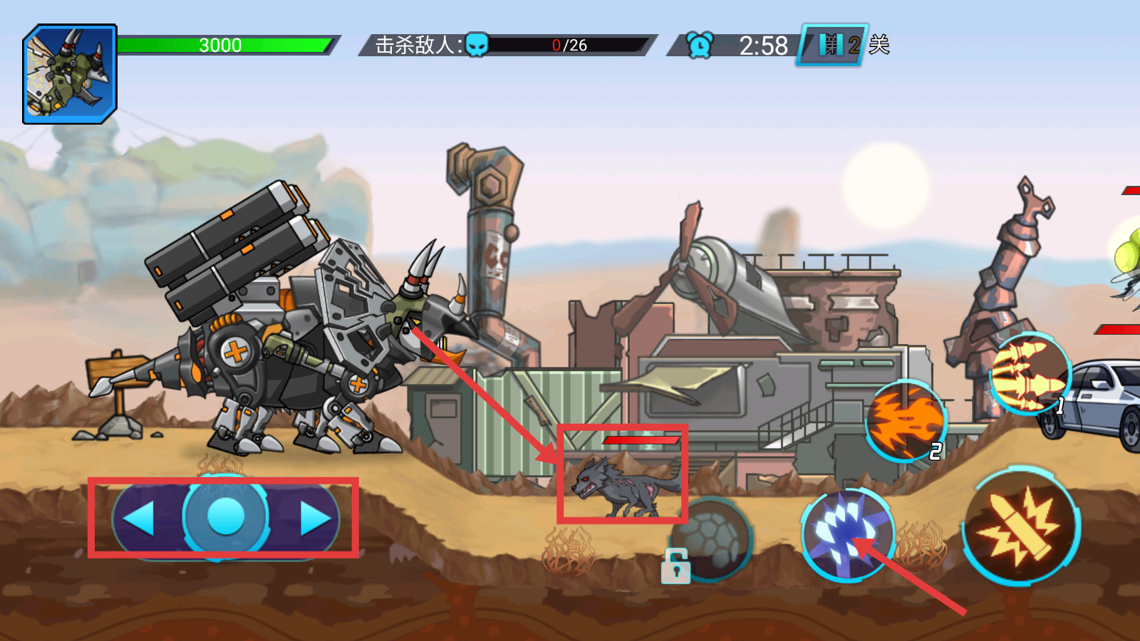 2、在【第2关】中,操控机甲移动,使用技能攻击【灰色狼形敌人】,推进击杀敌人的进度。