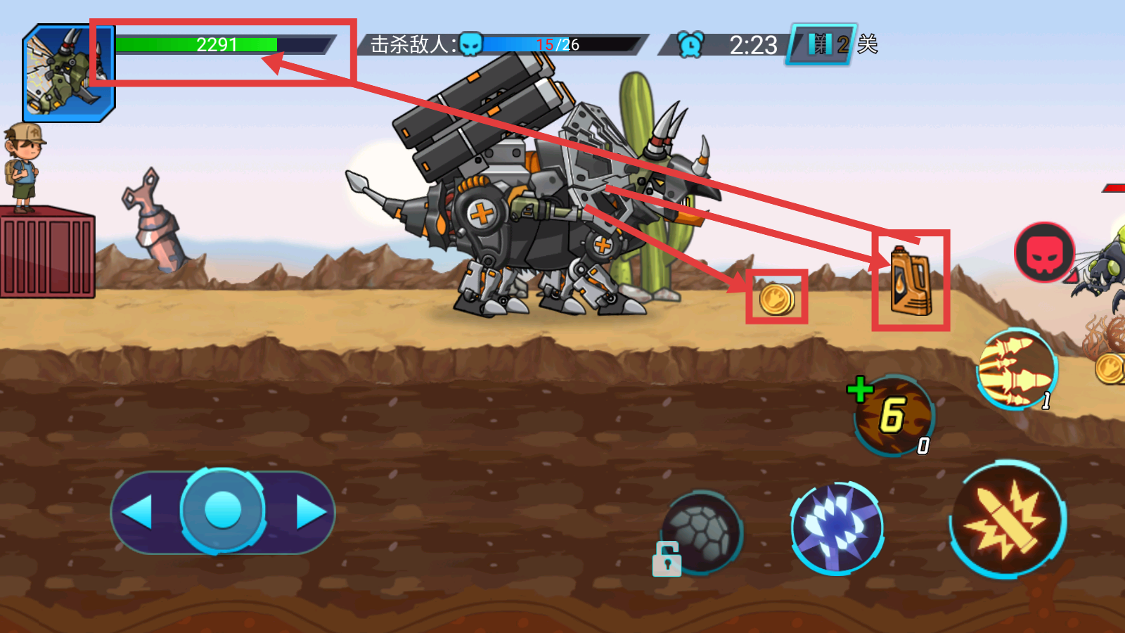 3、战斗中关注机甲【血量-2291】,同时收集【金币】和【油桶】,提升资源储备与续航能力。