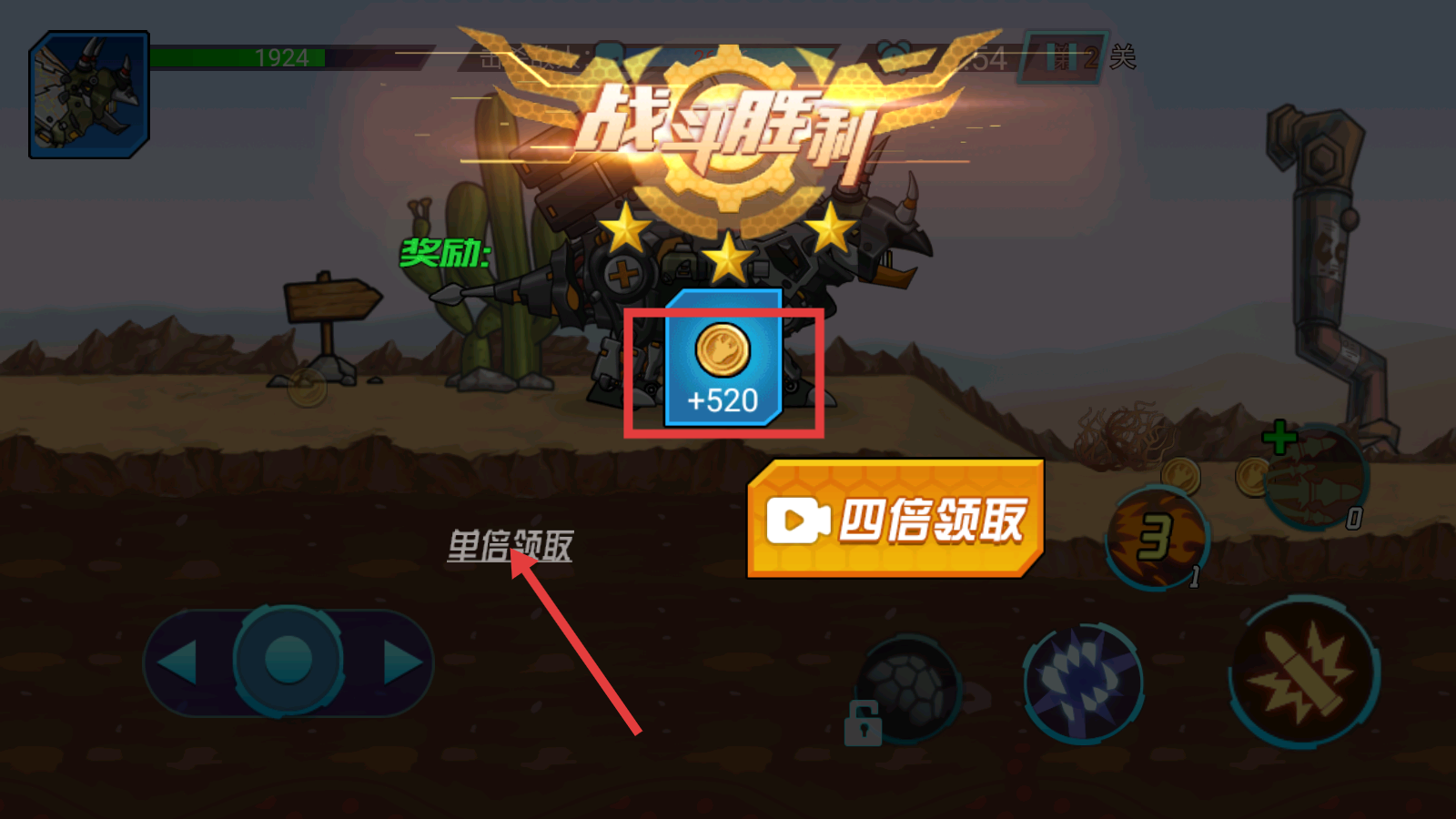 4、战斗胜利后,领取【金币+520】,点击【单倍领取】,积累资源用于后续关卡的机甲强化。