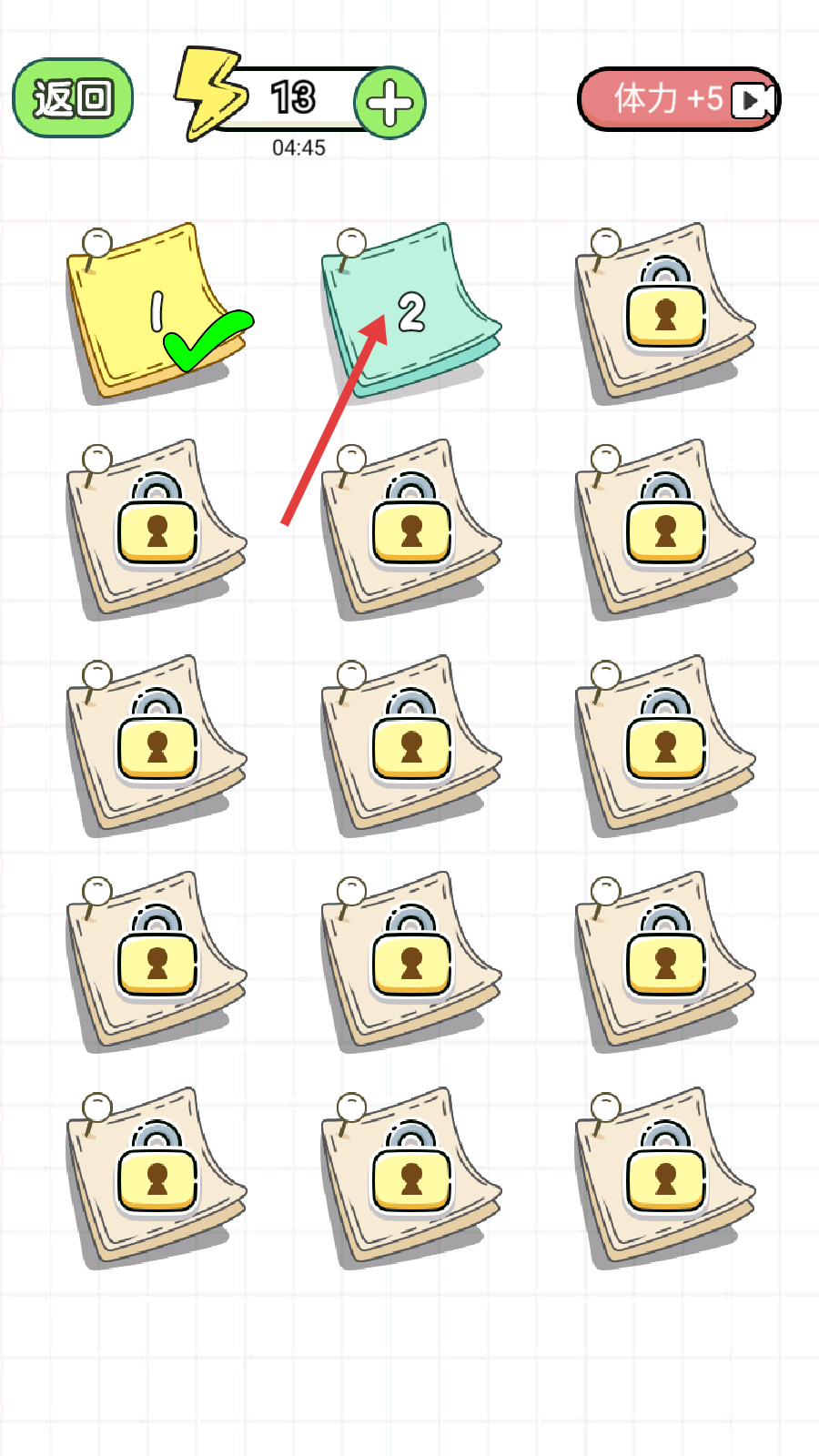 1、完成第1关后,点击标有【2】的关卡进入第2关,留意体力数值,按顺序推进关卡解锁。