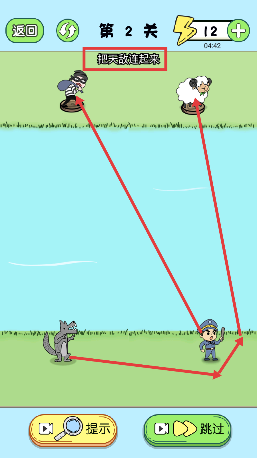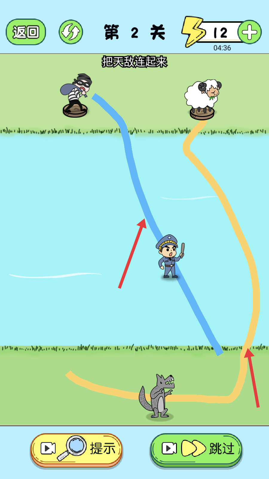2、在第2关,明确任务【把天敌连起来】,识别小偷与警察、狼与羊的天敌关系,为连线操作做准备。