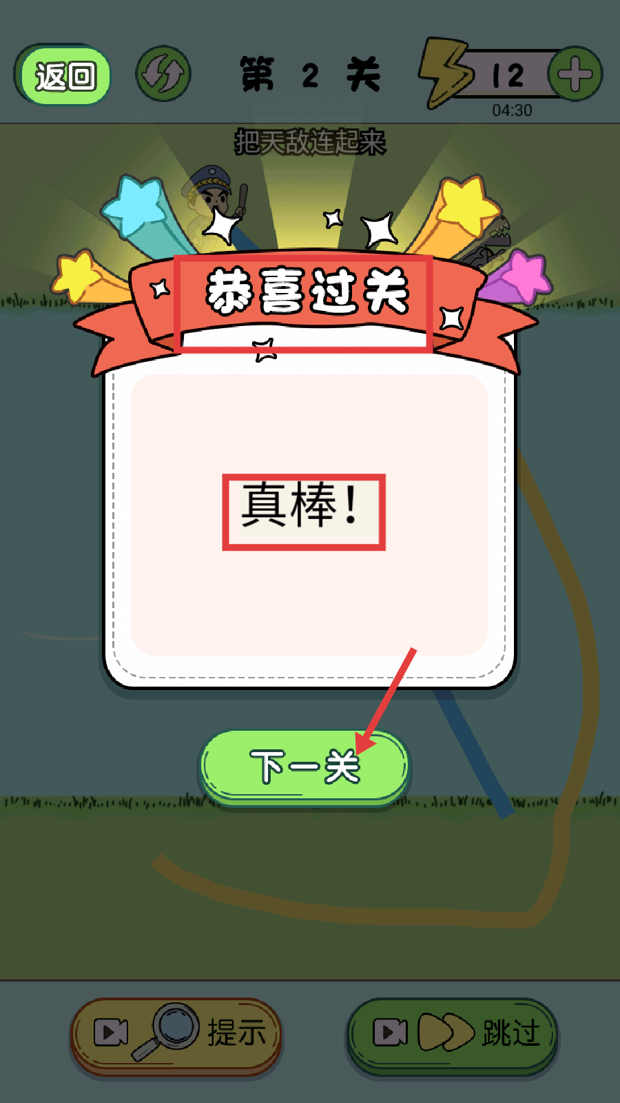 4、通关后点击【下一关】按钮,继续挑战后续关卡,总结连线技巧以提升通关效率。