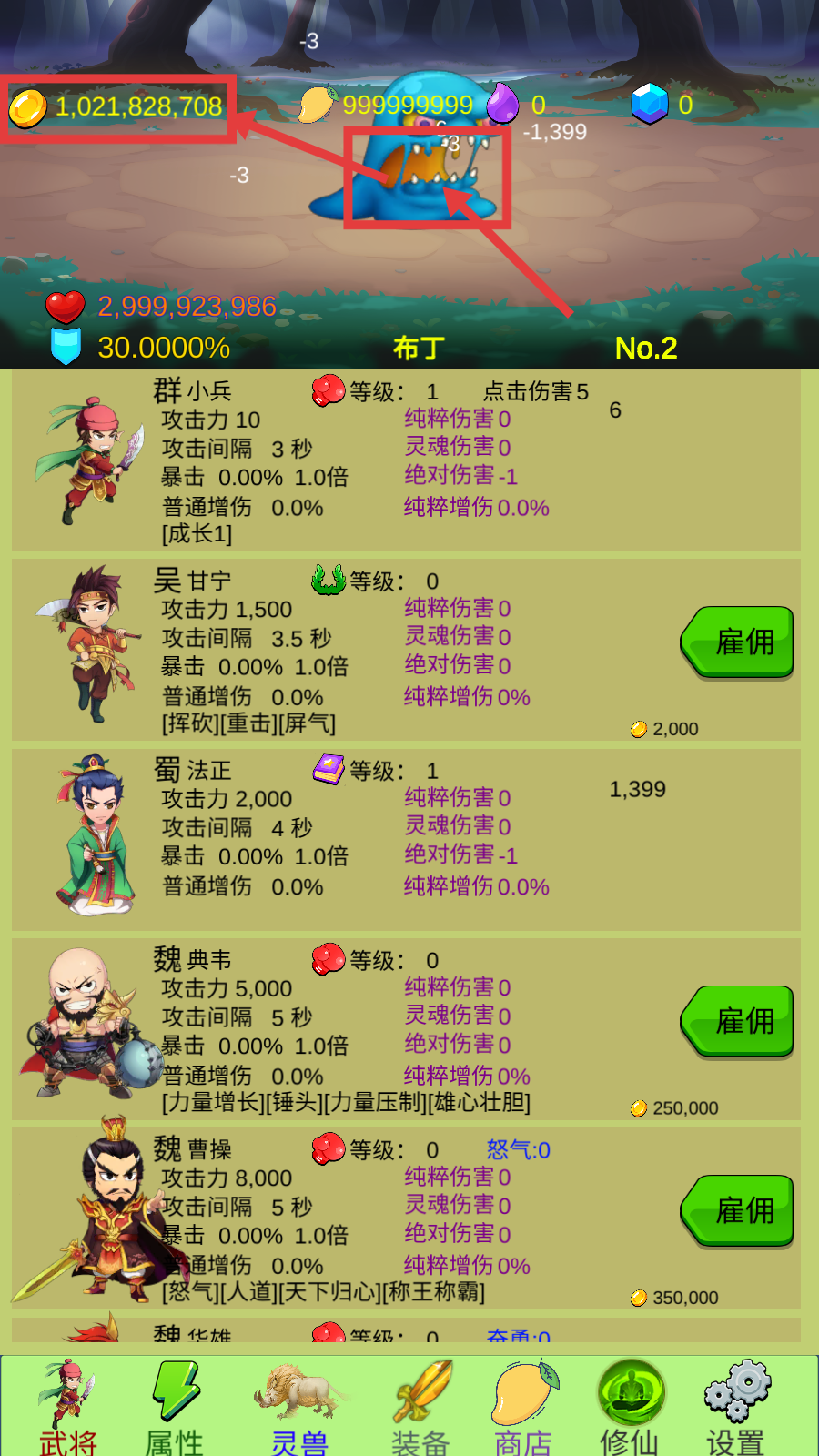 1、利用【金币-1,021,828,708】,派遣武将攻击【布丁-No.2】,关注武将攻击力与攻击间隔,逐步提升对怪物的伤害。