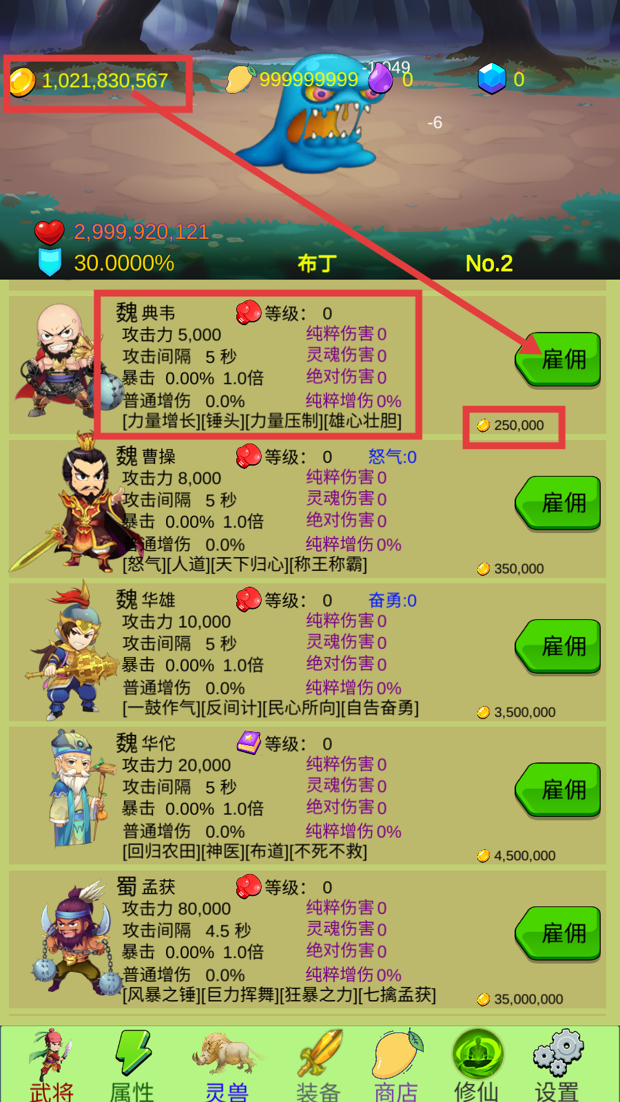 2、攒够【250,000】金币,雇佣【魏-典韦】,借助其高攻击力提升战力,助力击败怪物【布丁-No.2】。