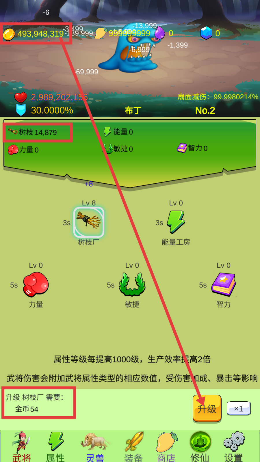 3、消耗金币升级【树枝厂-Lv8】,提高树枝生产效率,积累资源以支持武将养成和怪物挑战。