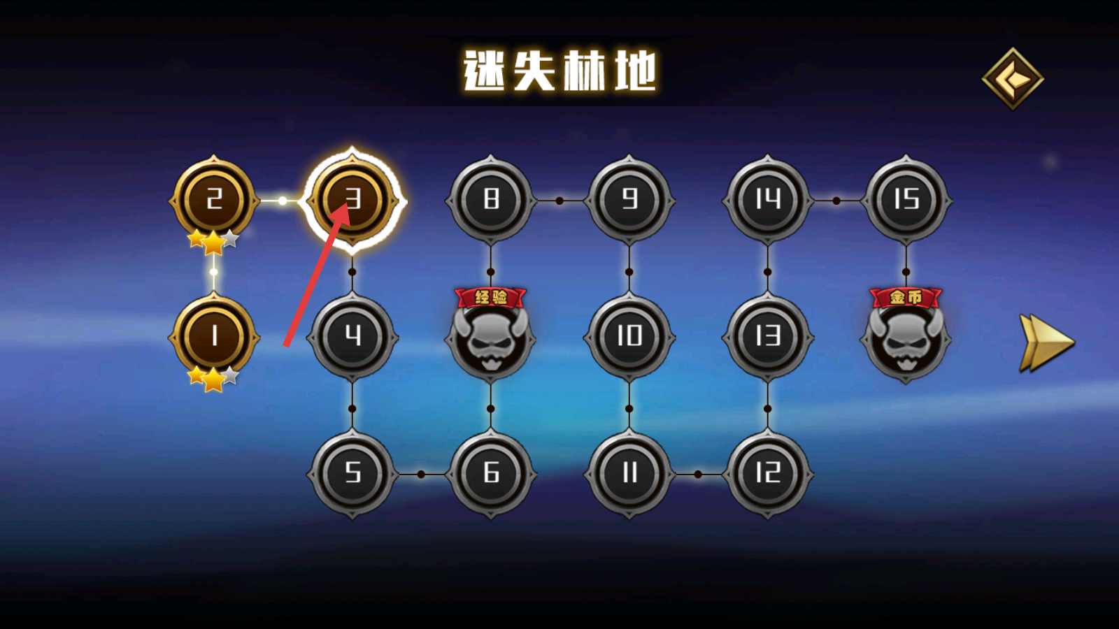 1、进入【迷失林地-第3关】,按关卡解锁顺序推进,开启该关卡的冒险挑战。