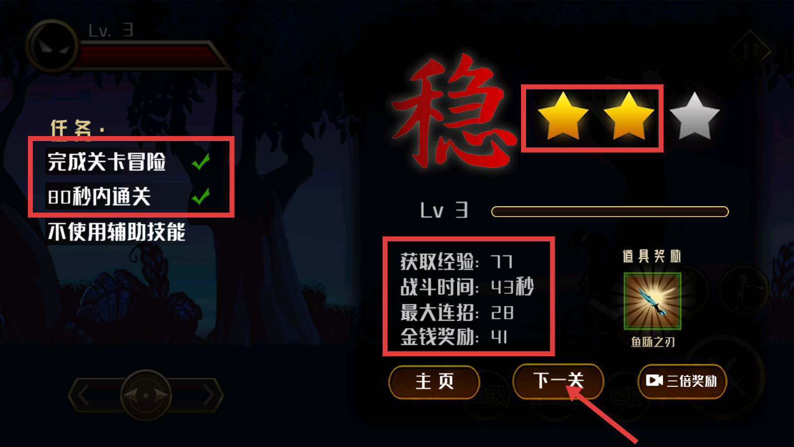 4、通关后获取【经验-77-金钱奖励-41】,获得【鱼肠之刃】道具,点击【下一关】继续挑战以提升星级评价。