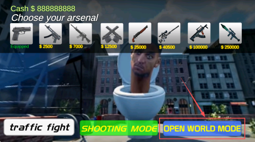 2、如何选择模式:在武器选择界面,点击“OPEN WORLD MODE”按钮,选择游戏模式。