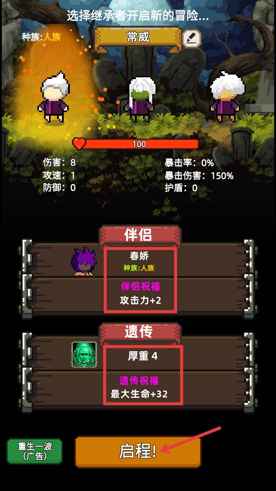 2、选择人族继承者【常威】,借助伴侣【春娇】的攻击力+2和遗传祝福【厚重4】的最大生命+32,点击【启程!】开启新冒险。