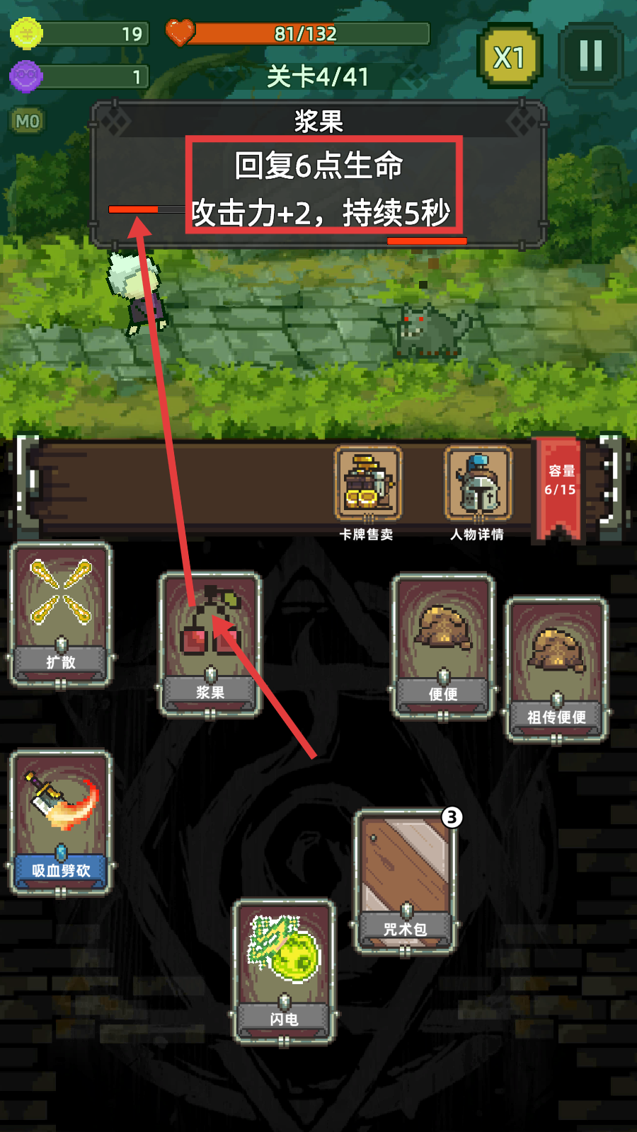 3、在关卡4/41中,使用【浆果】卡牌,可回复6点生命且攻击力+2持续5秒,提升战斗续航与输出。