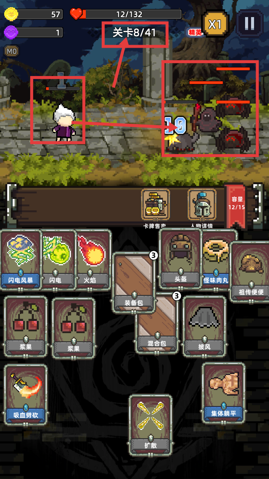 4、挑战关卡8/41精英怪时,关注怪物数量,合理搭配【闪电风暴】【吸血劈砍】等卡牌,高效通关。