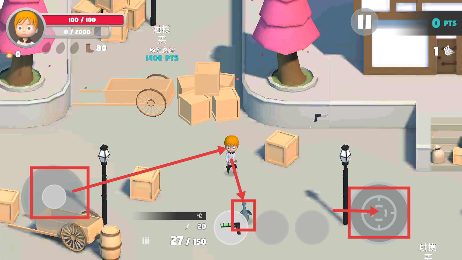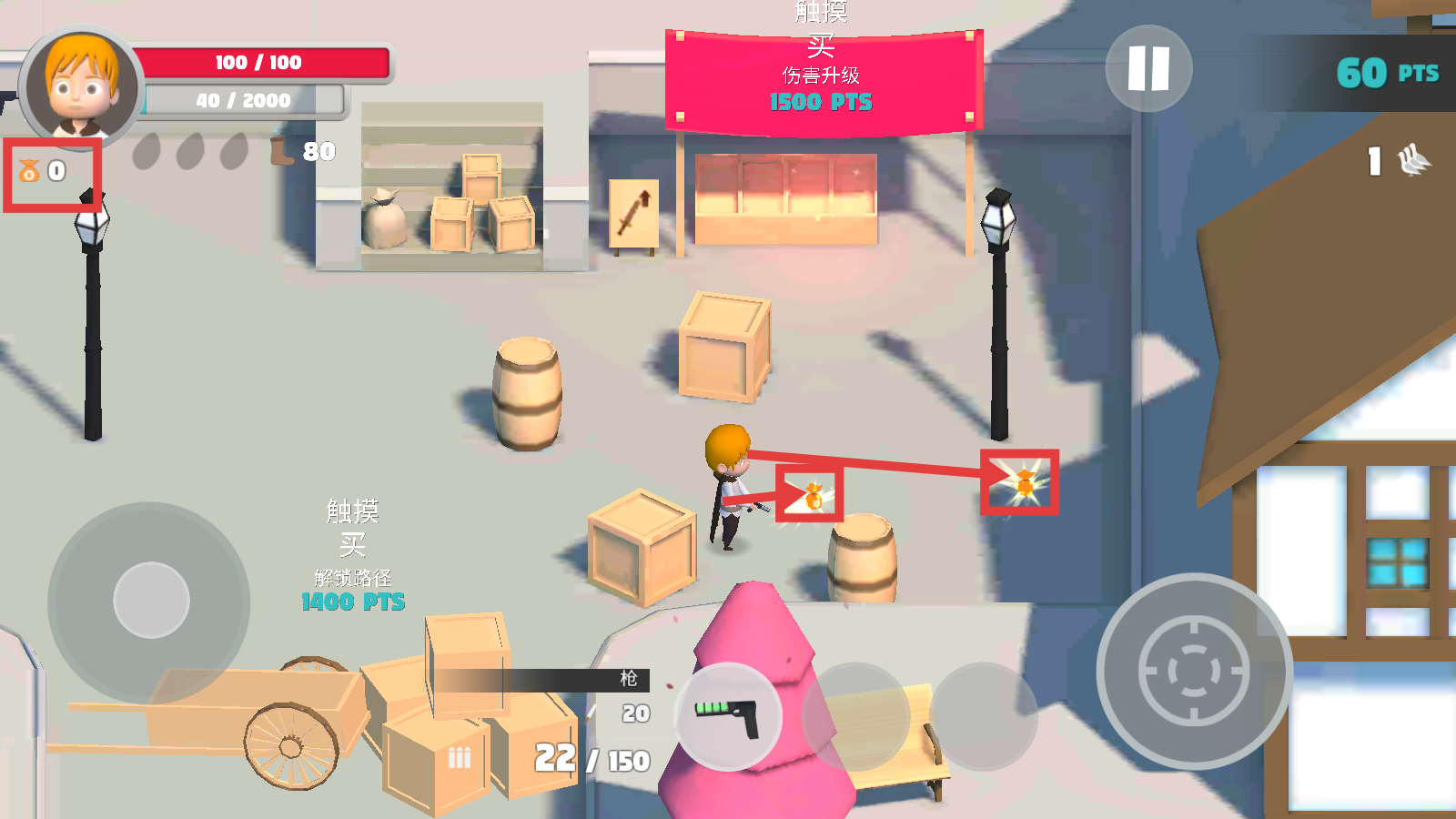 2、冒险中通过左侧虚拟摇杆移动角色,点击右侧射击按钮攻击鸽子,注意保持血量【100/100】。