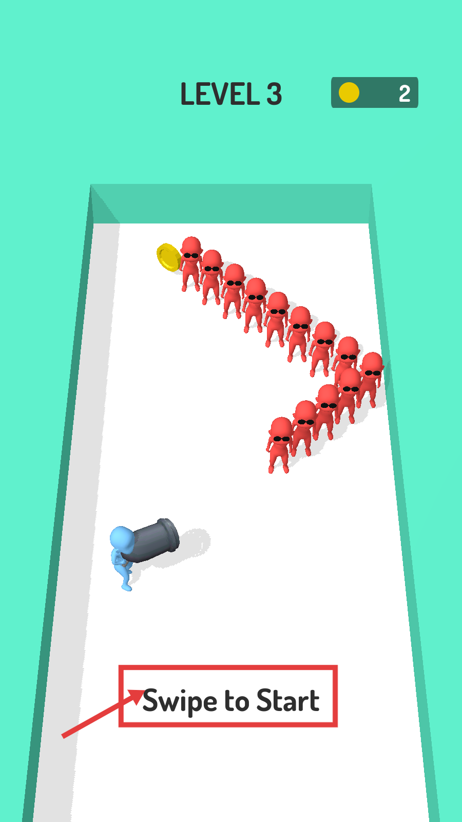 1、进入【LEVEL-3】后,滑动屏幕触发【Swipe-to-Start】,操控蓝色小人持大炮准备攻击红色小人队列。