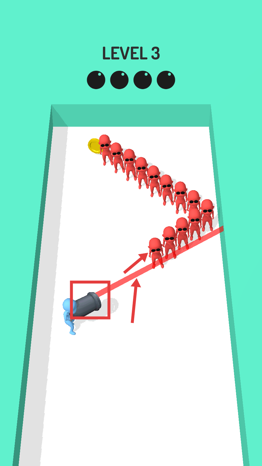 2、瞄准红色小人队列,发射大炮攻击,注意瞄准线的方向,确保击中目标。