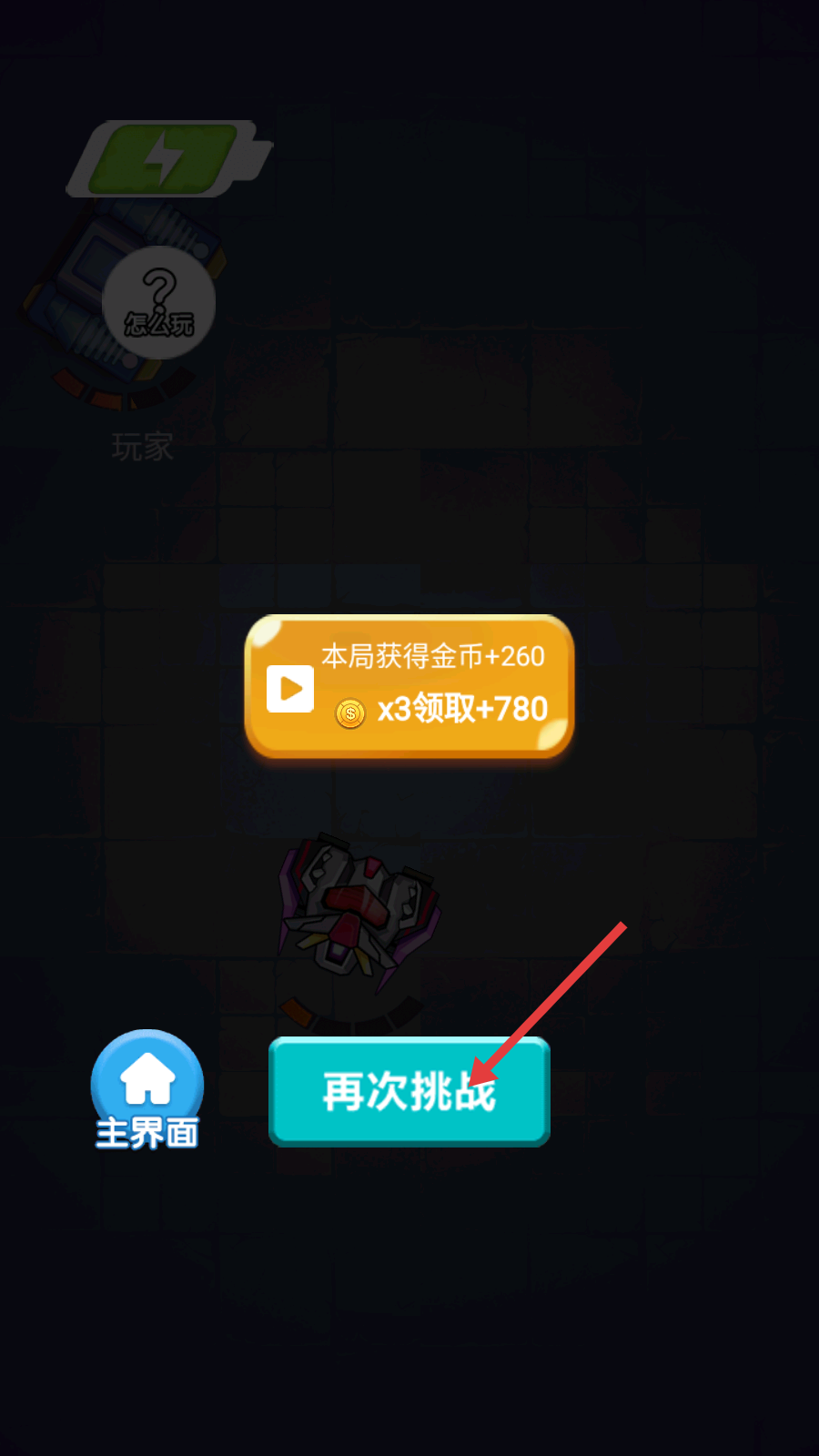 4、完成对局后,点击【再次挑战】按钮继续游戏,积累金币以升级坦克,争取更好战绩。