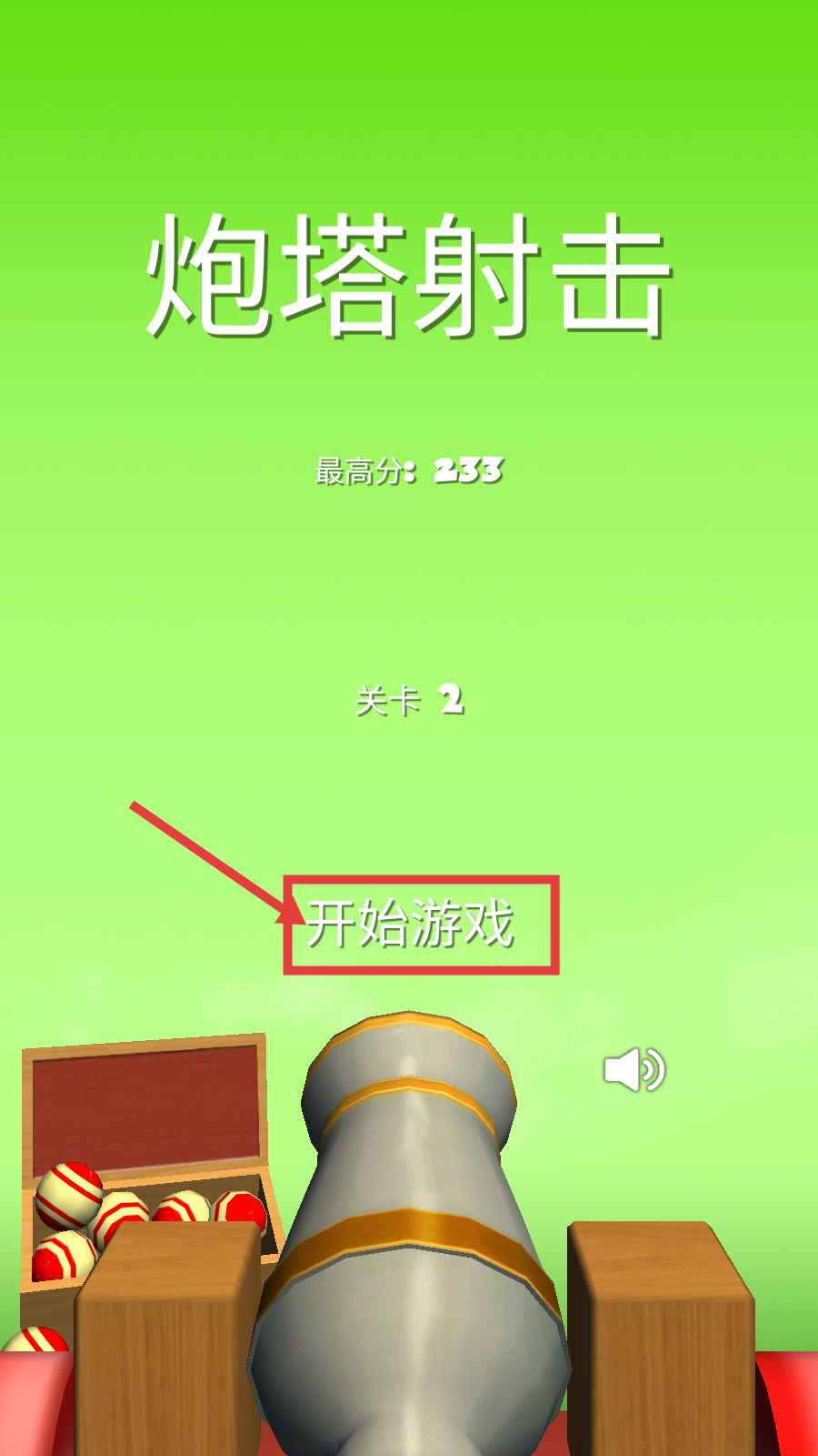 1、进入【炮塔射击】关卡2,点击【开始游戏】按钮,开启炮弹射击任务,目标是打破方块堆获取分数。