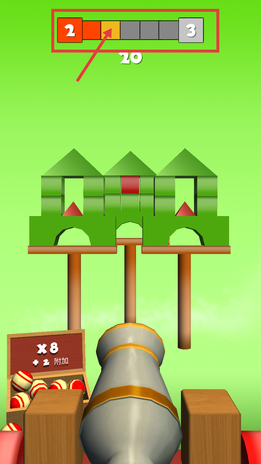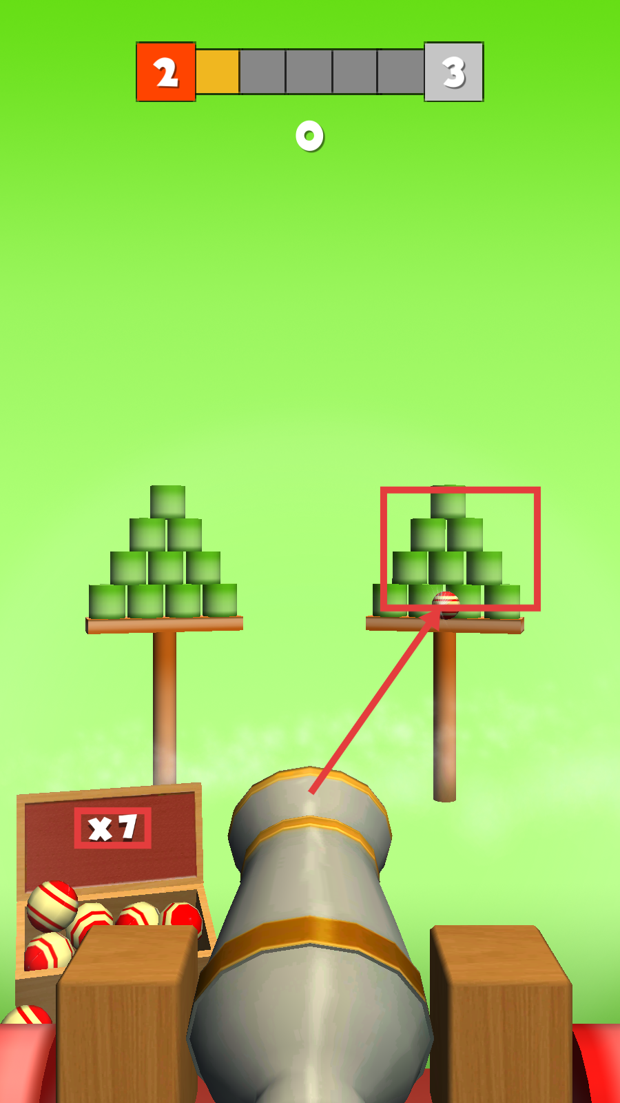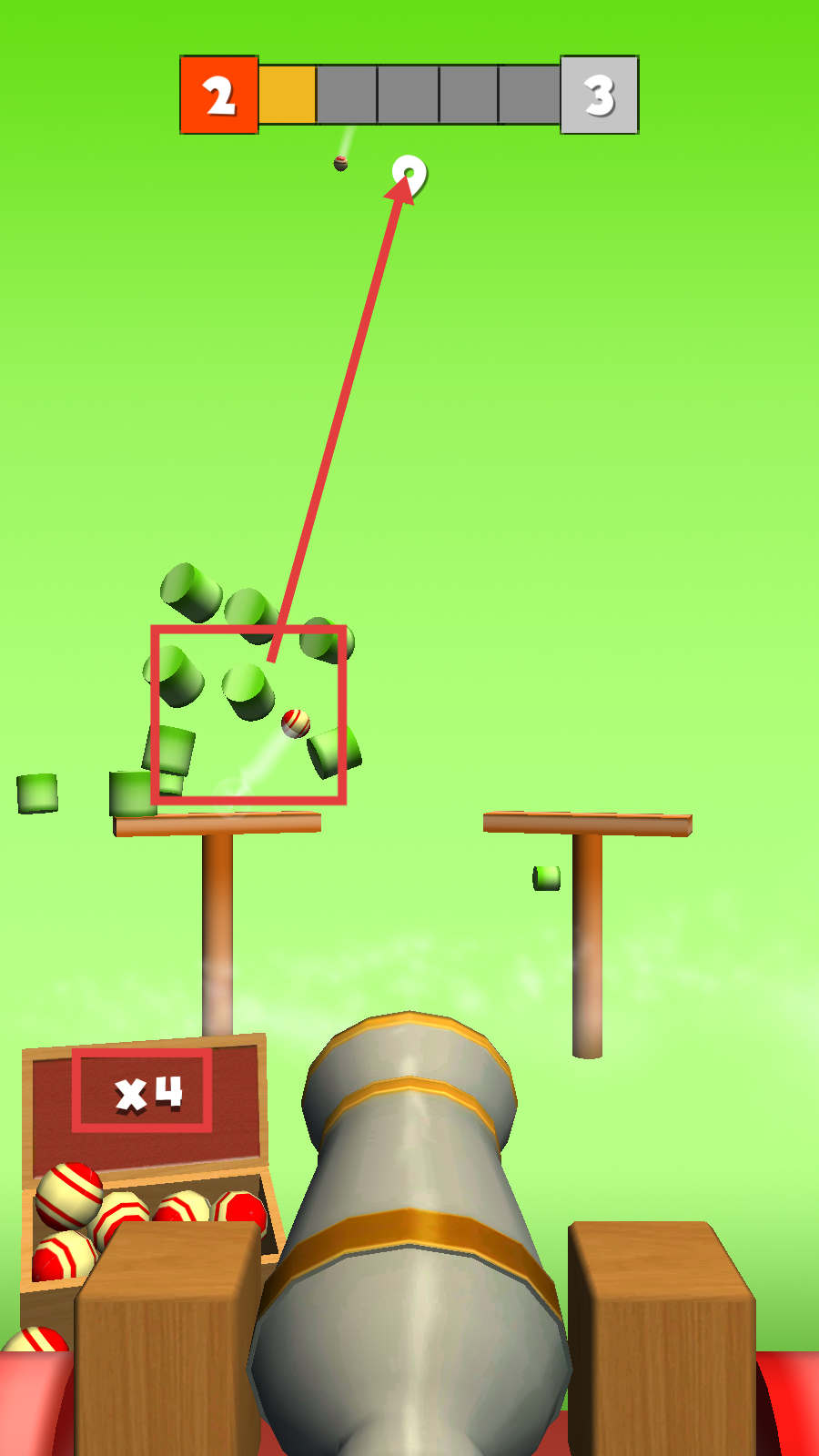 2、瞄准带有红白球的绿色方块堆,发射炮弹攻击,精准命中可快速打破方块堆。