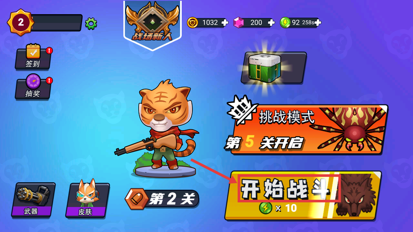 1、在第2关界面,点击【开始战斗】,消耗【10】闪电进入关卡,可先通过【签到】【抽奖】获取资源,提升战力再开战。