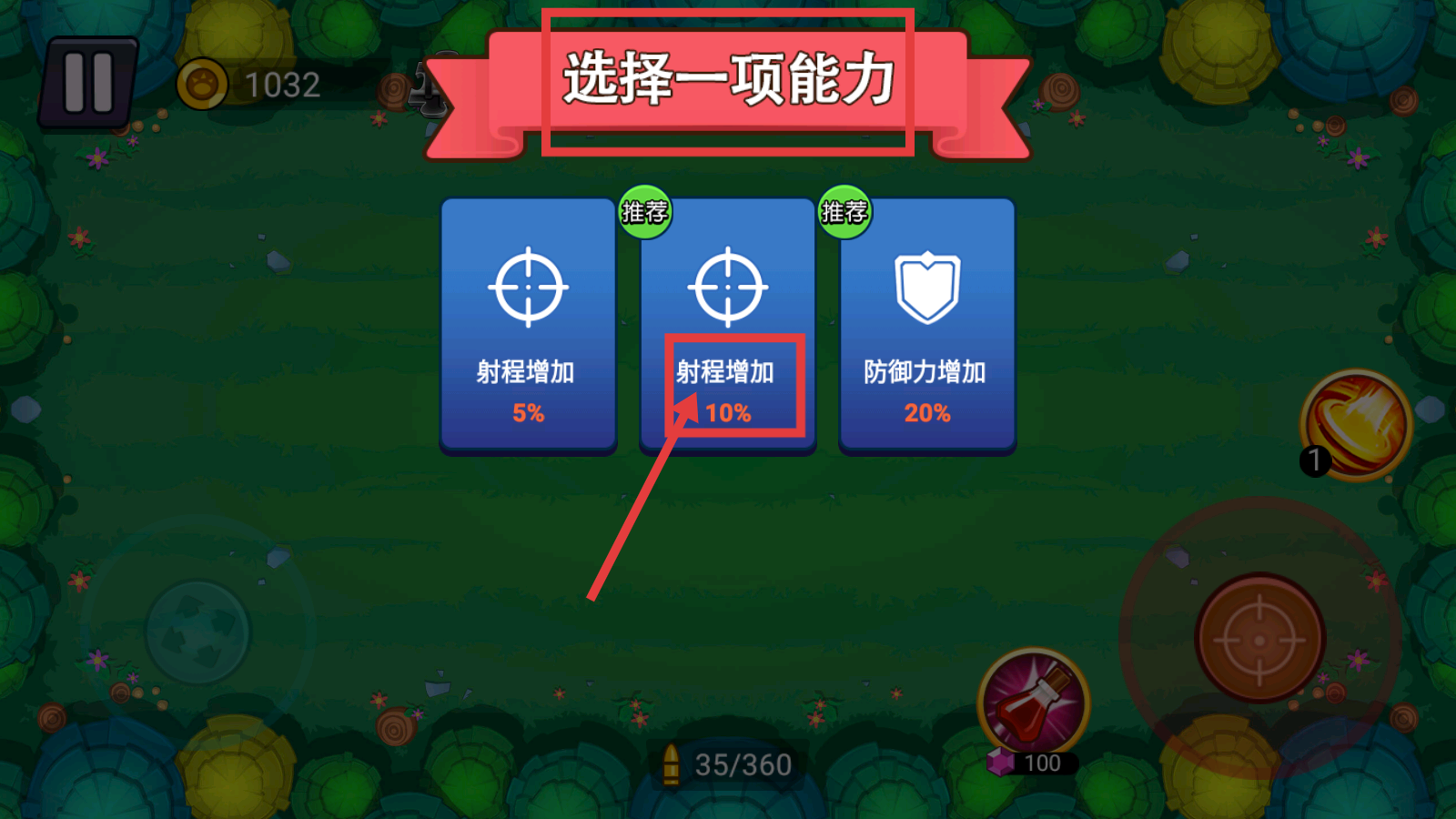 2、选择能力时优先选【射程增加-10%】,提升攻击范围,能更高效远程打击敌人,助力关卡推进。
