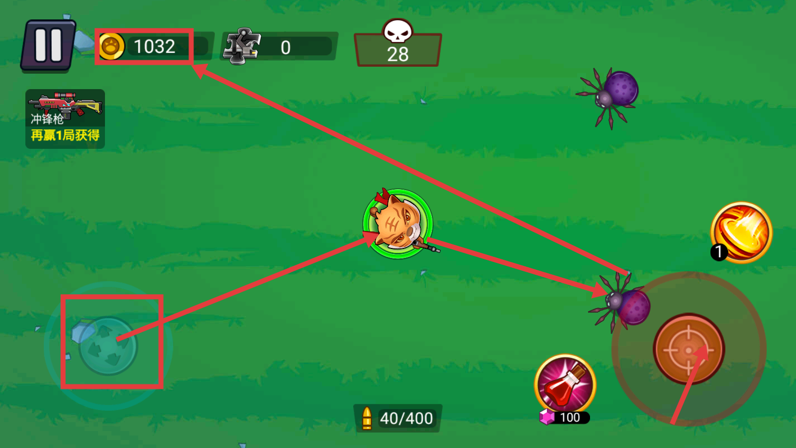 3、战斗中操控左下角虚拟摇杆移动角色,瞄准蜘蛛类敌人射击,积累【1032】金币可用于后续养成。