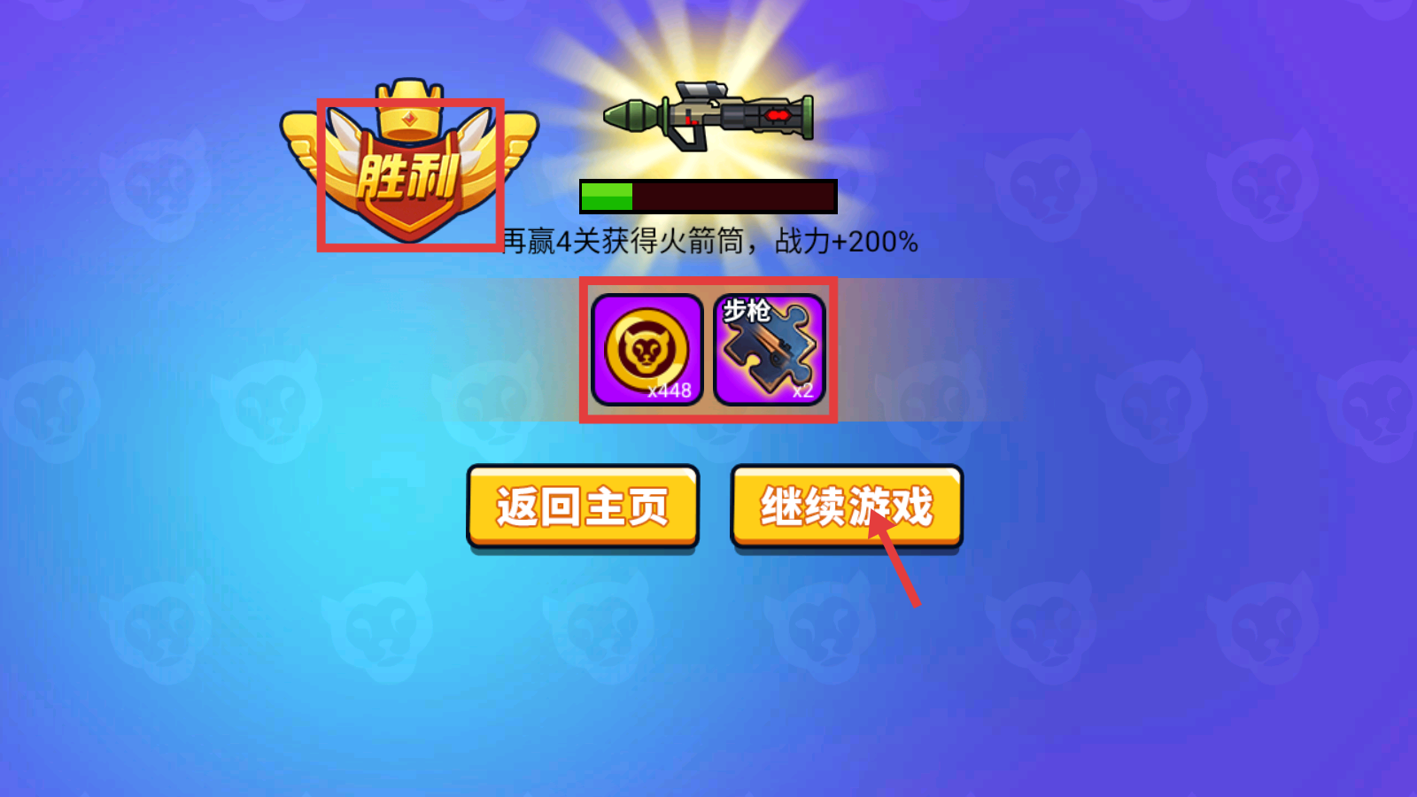 4、关卡胜利后获得【金币-x448】【步枪-碎片-x2】,点击【继续游戏】挑战下一关,积累资源可解锁火箭筒。