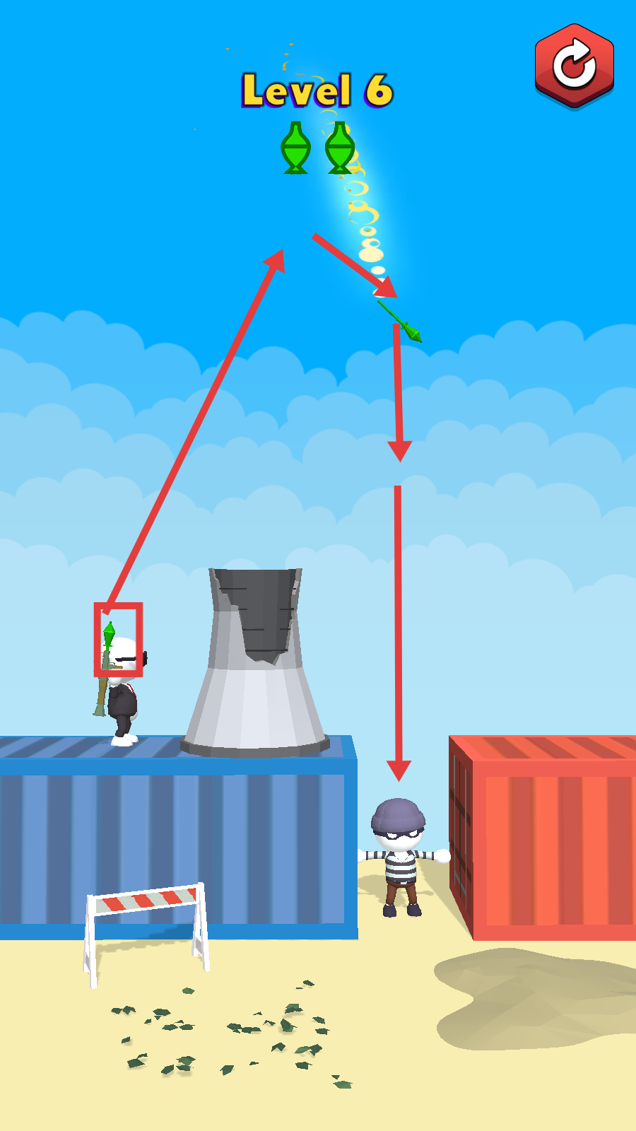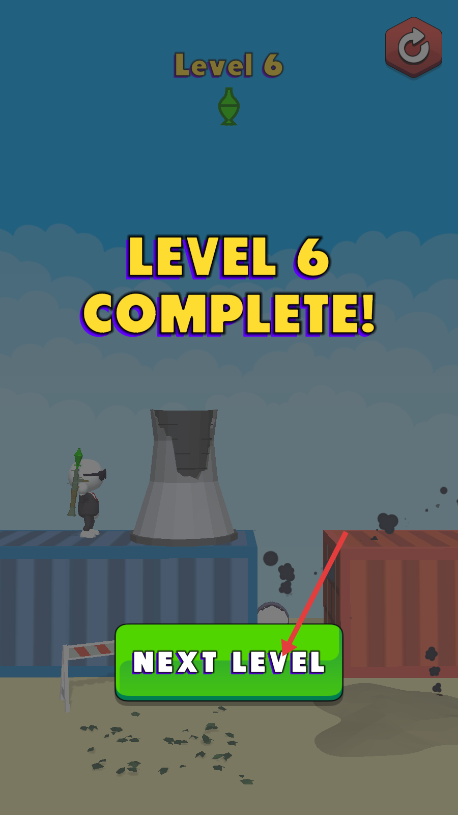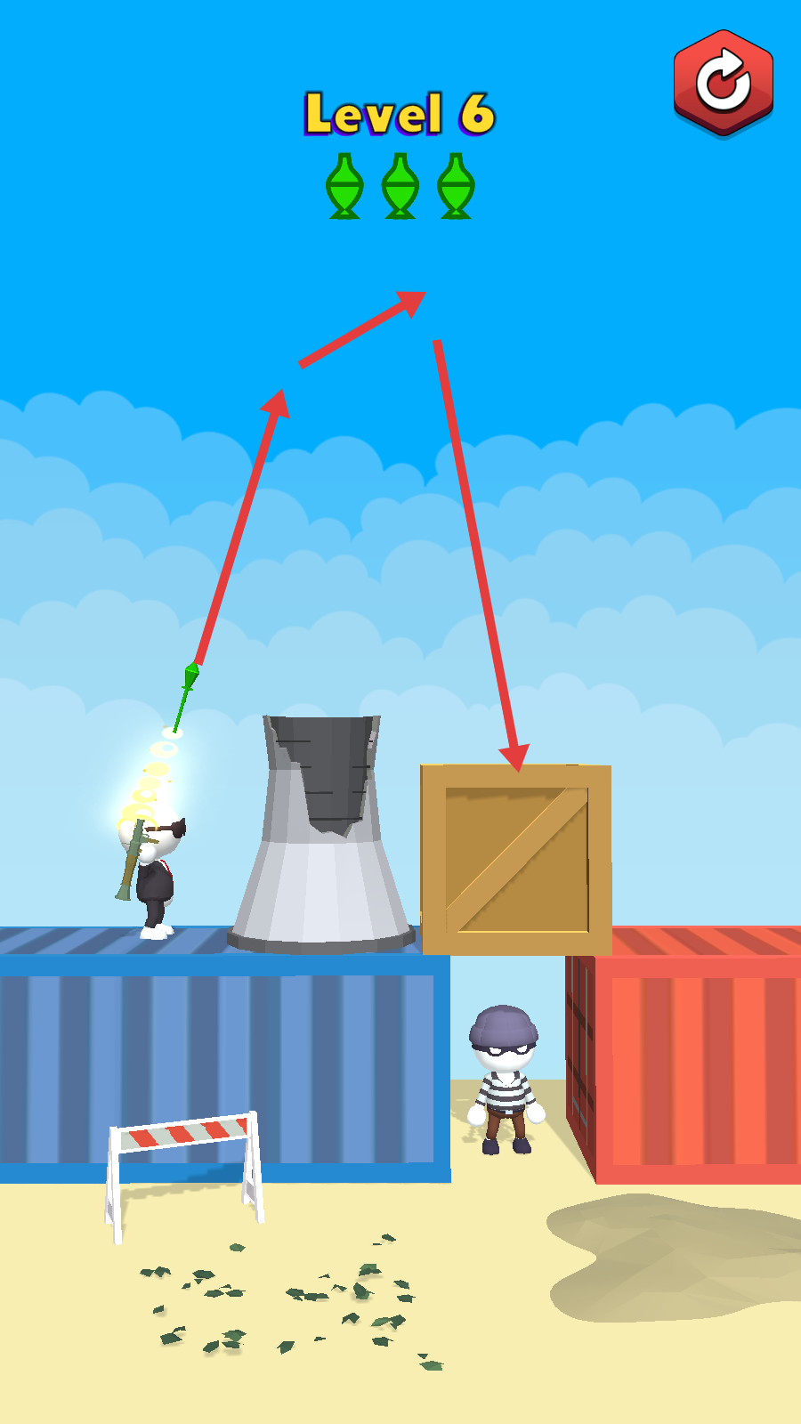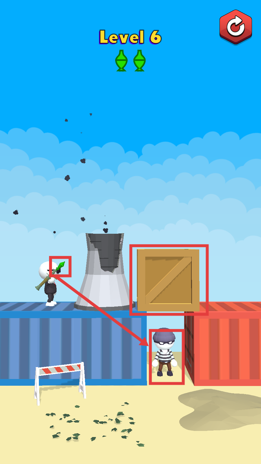 1、在【Level-6】关卡,观察敌人与木箱位置,利用武器瞄准,规划攻击路径,为清除障碍和消灭敌人做准备。