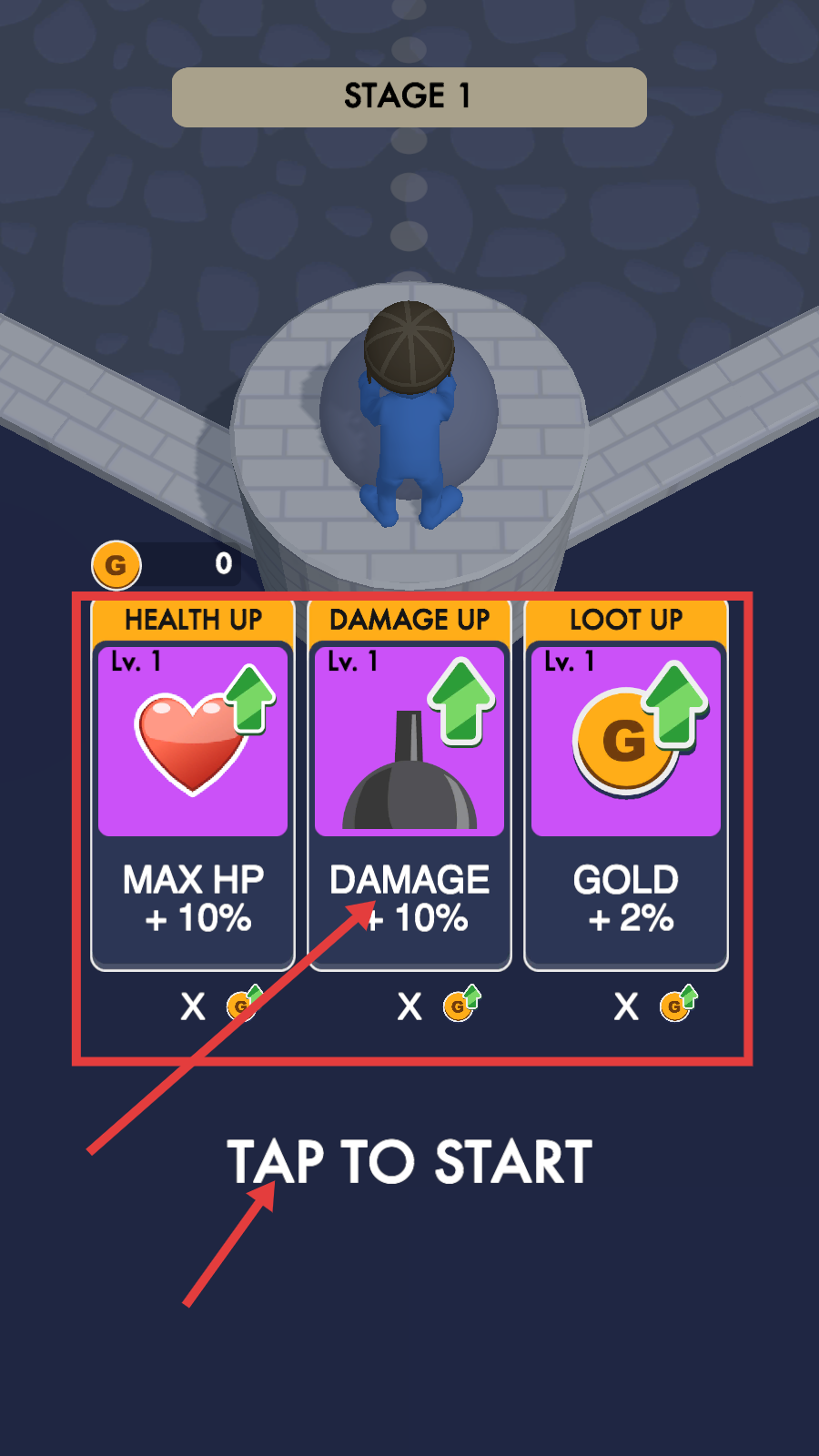 1、在【STAGE-1】开始前,可优先升级【DAMAGE-UP】提升伤害,然后点击【TAP-TO-START】进入战斗。