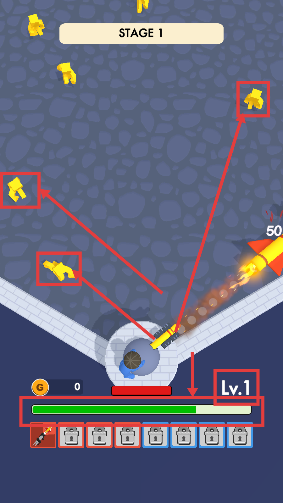 2、战斗中操控火箭攻击多个【黄色敌人】,注意提升等级,解锁更多武器,逐步清理战场。