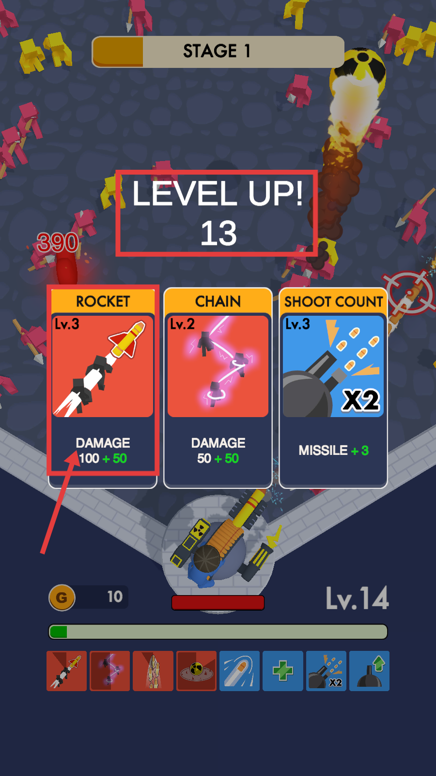 3、升级时优先选择【ROCKET】提升伤害至【100+50】,增强清敌效率,助力关卡推进。