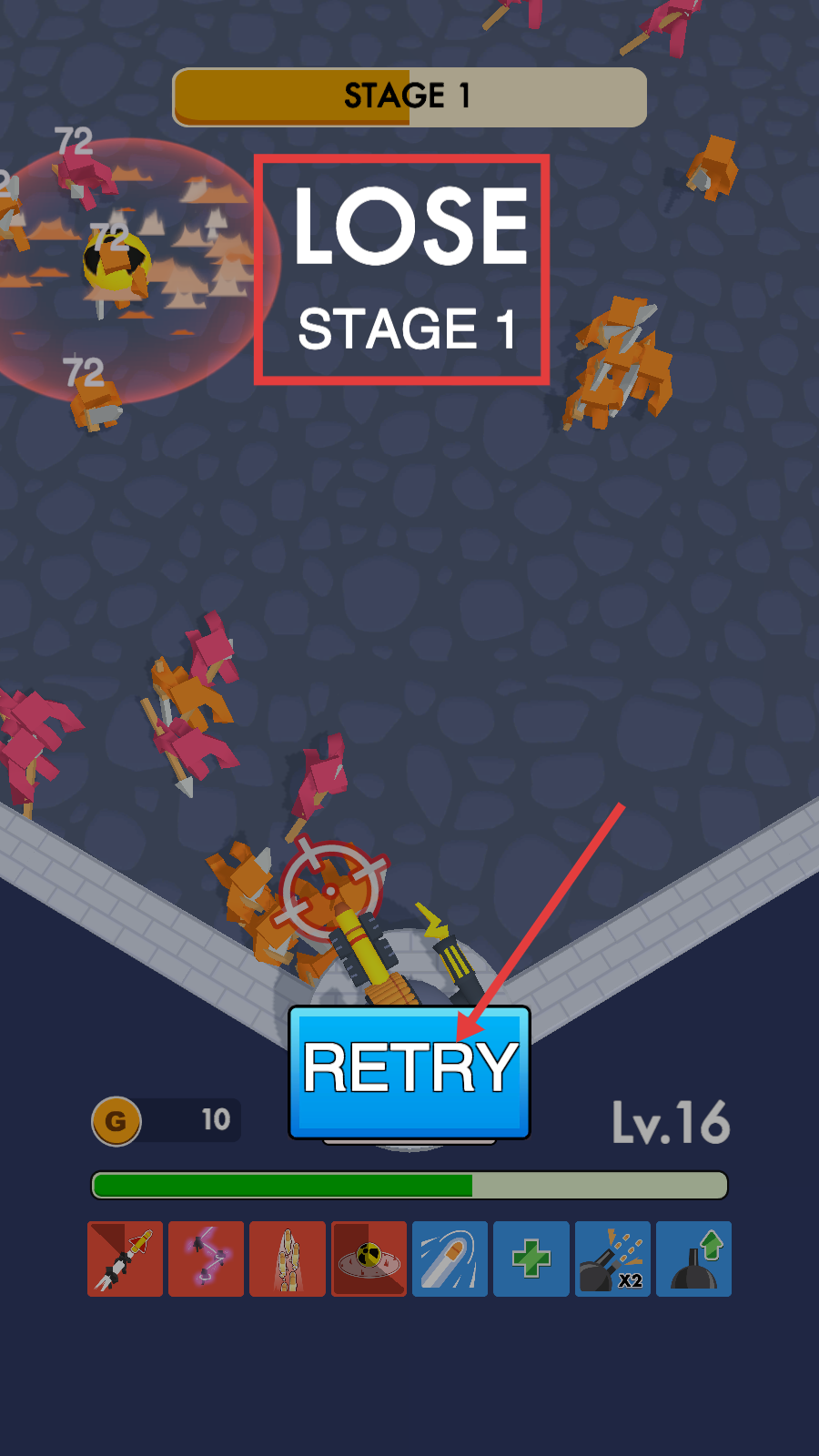 4、若关卡失败,点击【RETRY】重新挑战【STAGE-1】,利用积累的金币和升级策略,争取顺利通关。