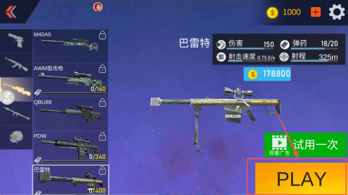 2、如何选择武器:在武器选择界面,查看不同武器的属性,点击“PLAY”按钮选择武器开始游戏。