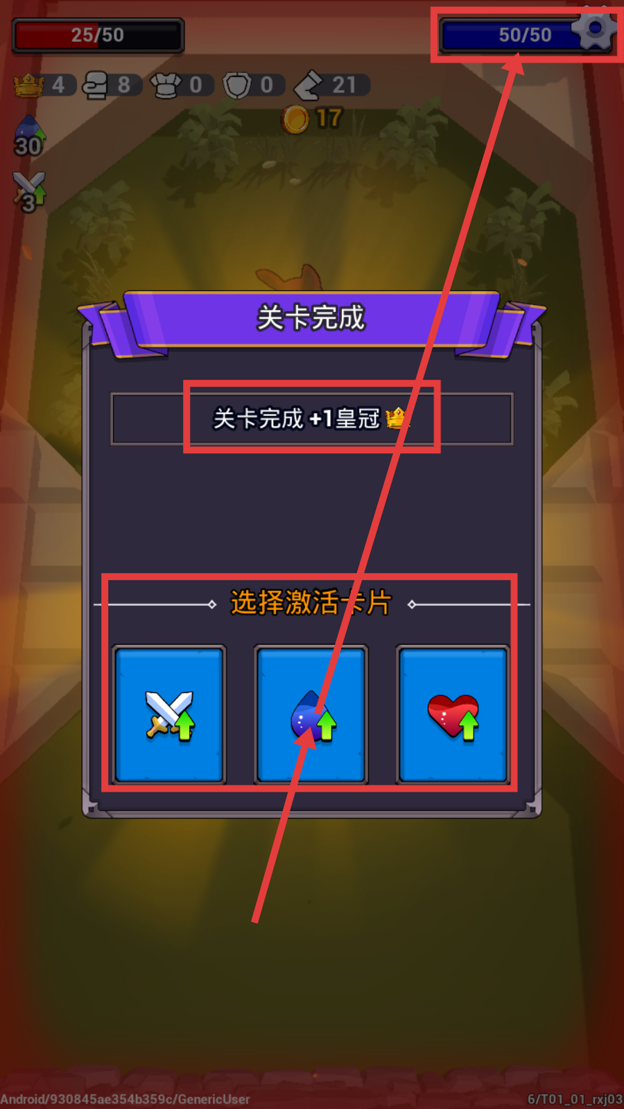 4、关卡完成后获得【+1皇冠】,选择激活卡片时,可根据需求选武器、属性或生命加成卡片,提升战力。