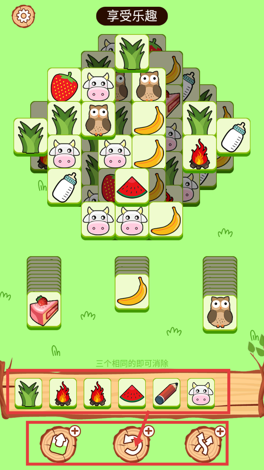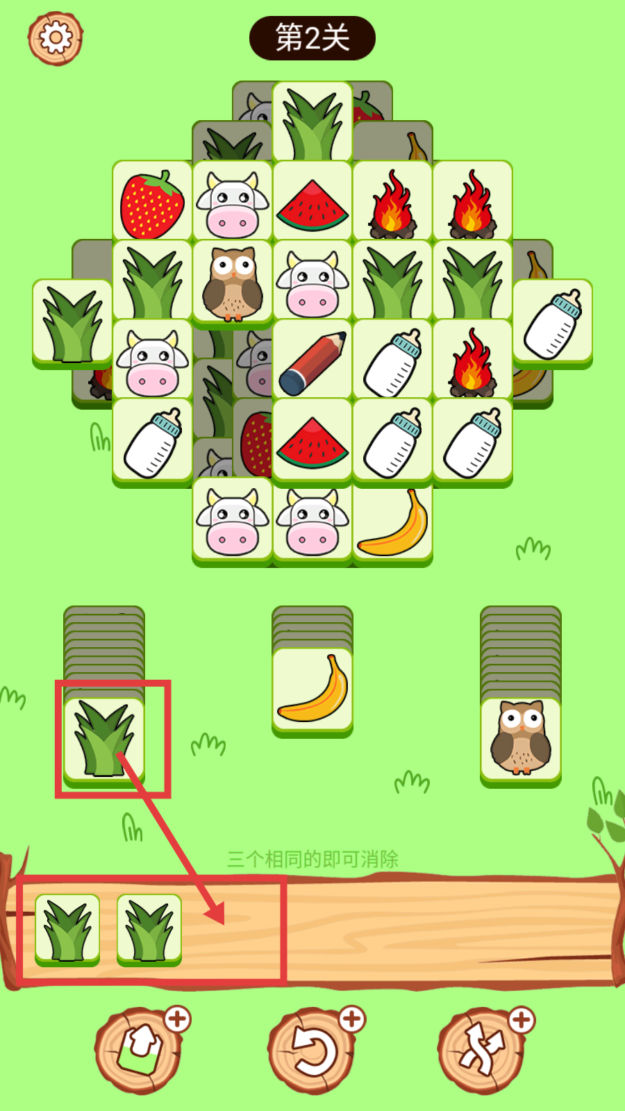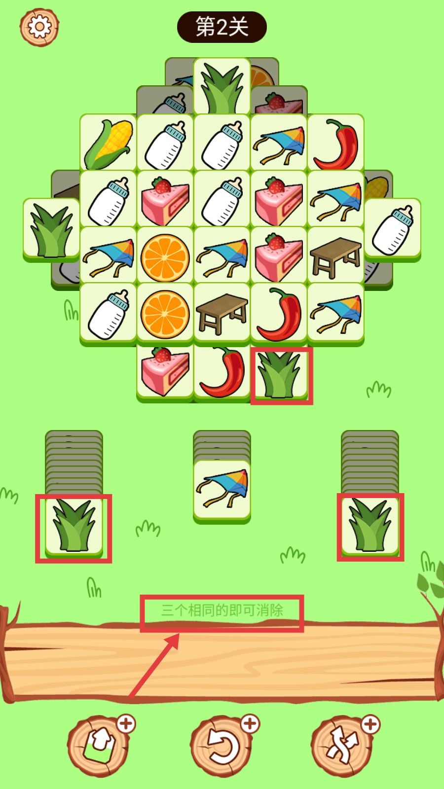 1、在第2关,根据【三个相同的即可消除】规则,收集三个相同的芦荟元素,开启消除进程。