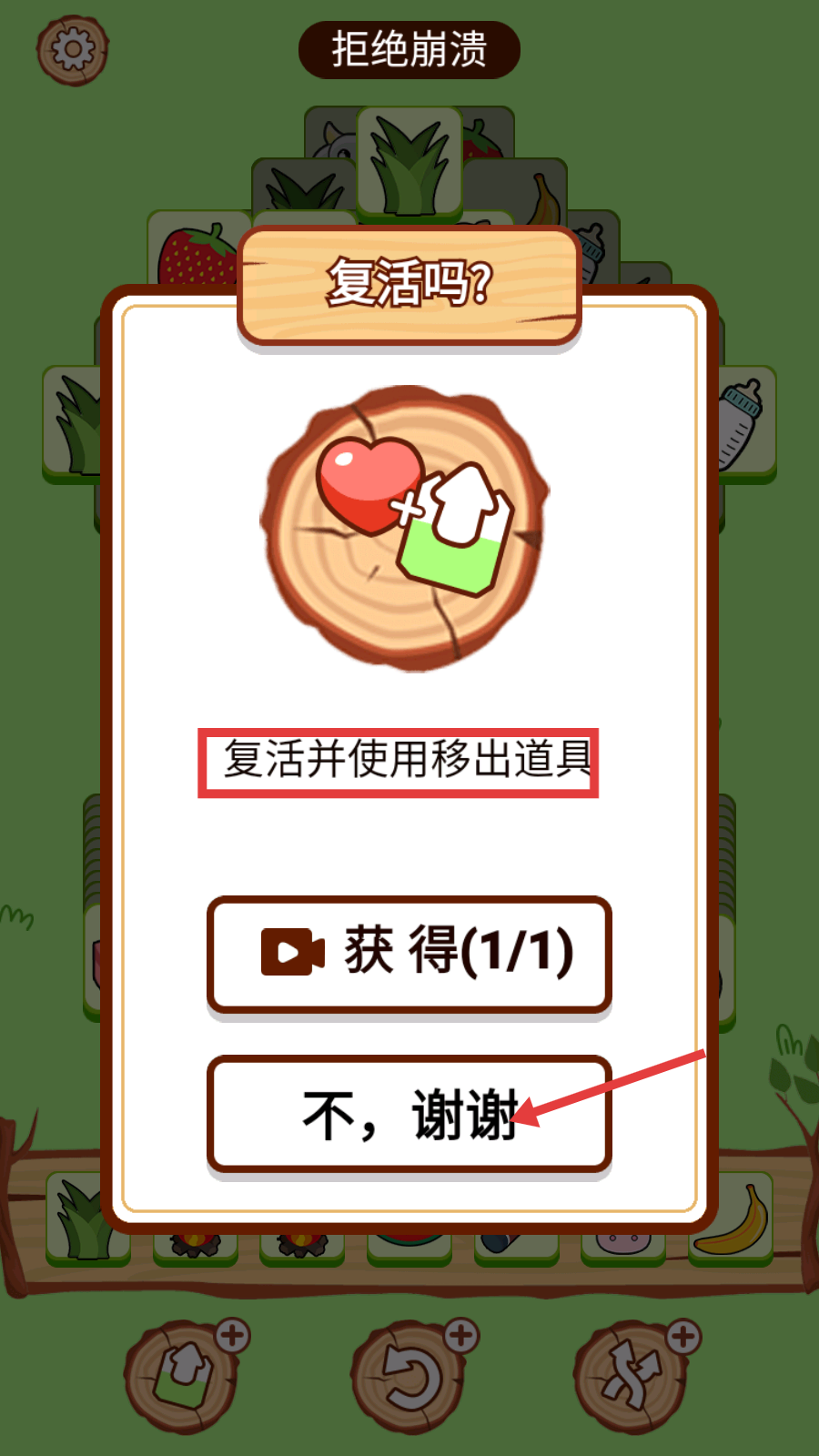 4、若游戏失败,会出现【复活吗?】提示,可选择观看视频复活或点击【不,谢谢】放弃复活。