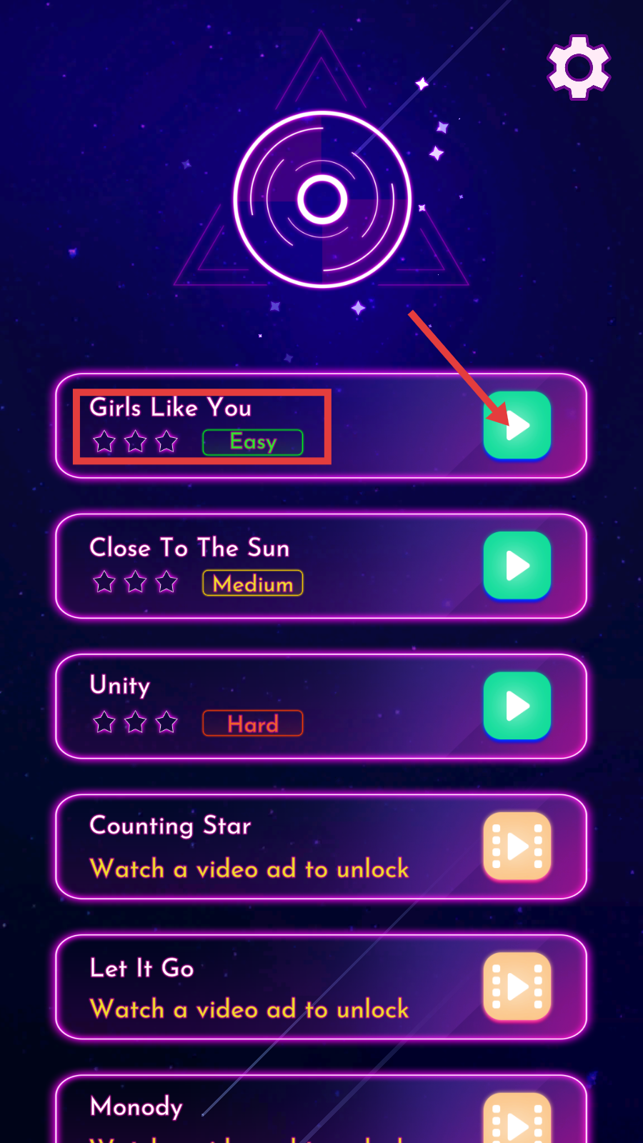 1、选择【Girls-Like-You】的【Easy】难度,点击右侧播放按钮,开启音乐节奏挑战。