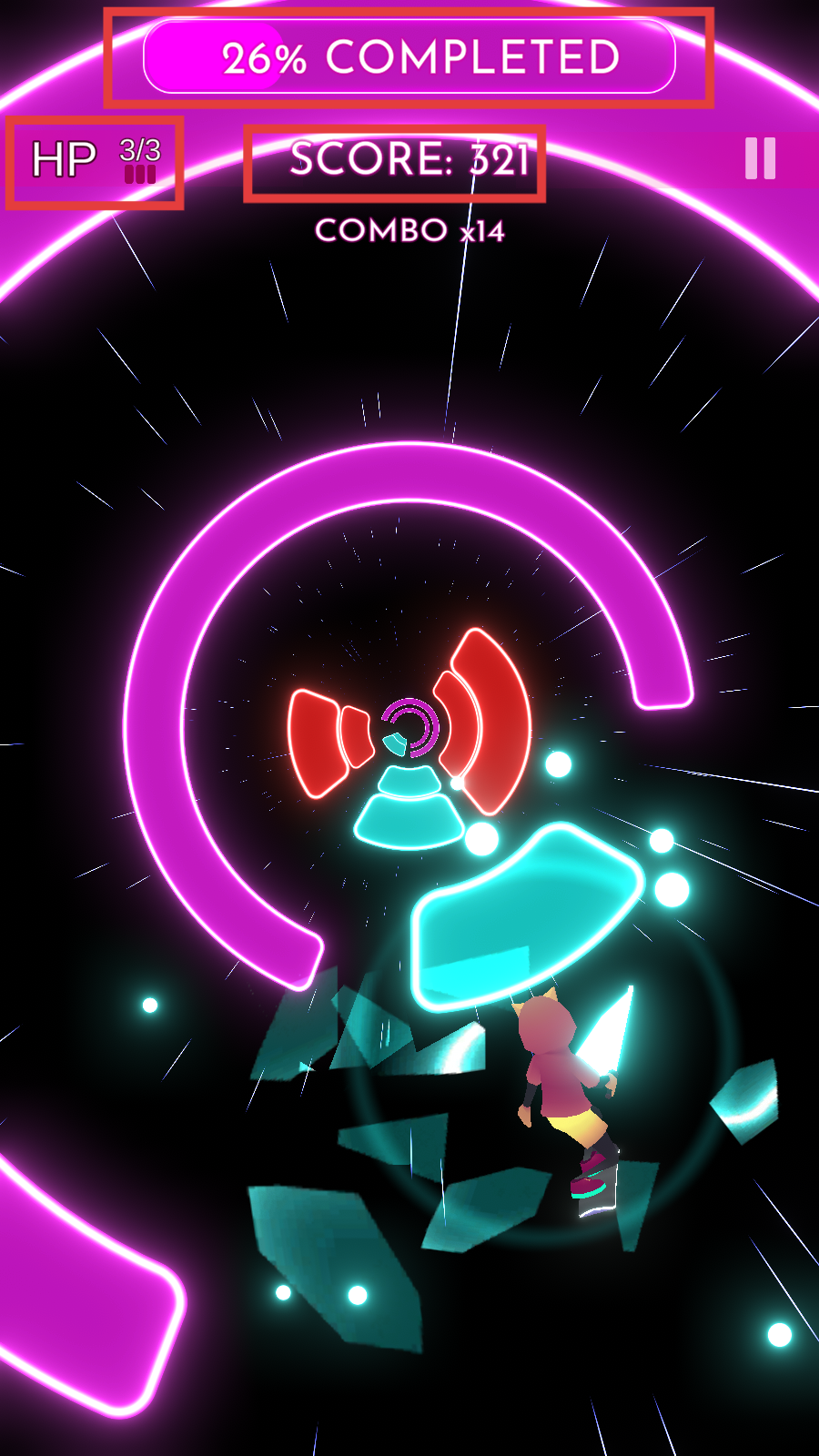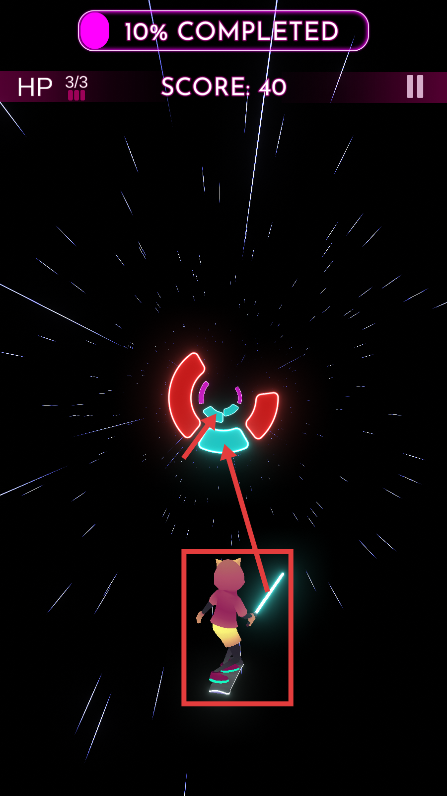 2、挑战中控制角色挥砍音符,注意保持【HP-3/3】,积累分数,推进【10%-COMPLETED】的关卡进度。