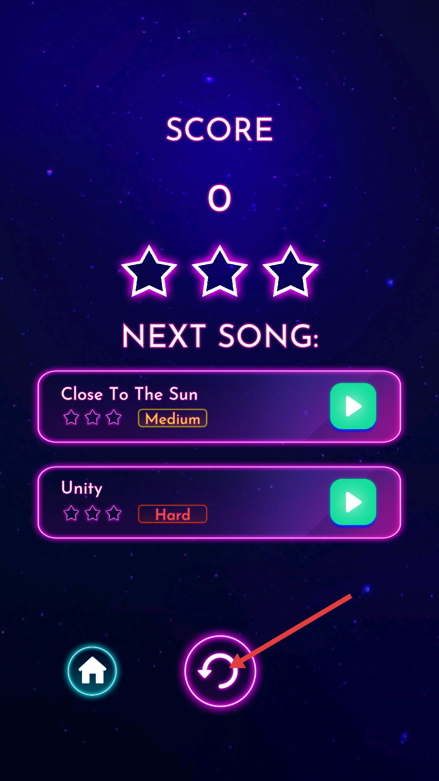 4、结算时若分数不理想,点击重玩按钮,可选择【Close-To-The-Sun】或【Unity】继续挑战,提升星级评价。