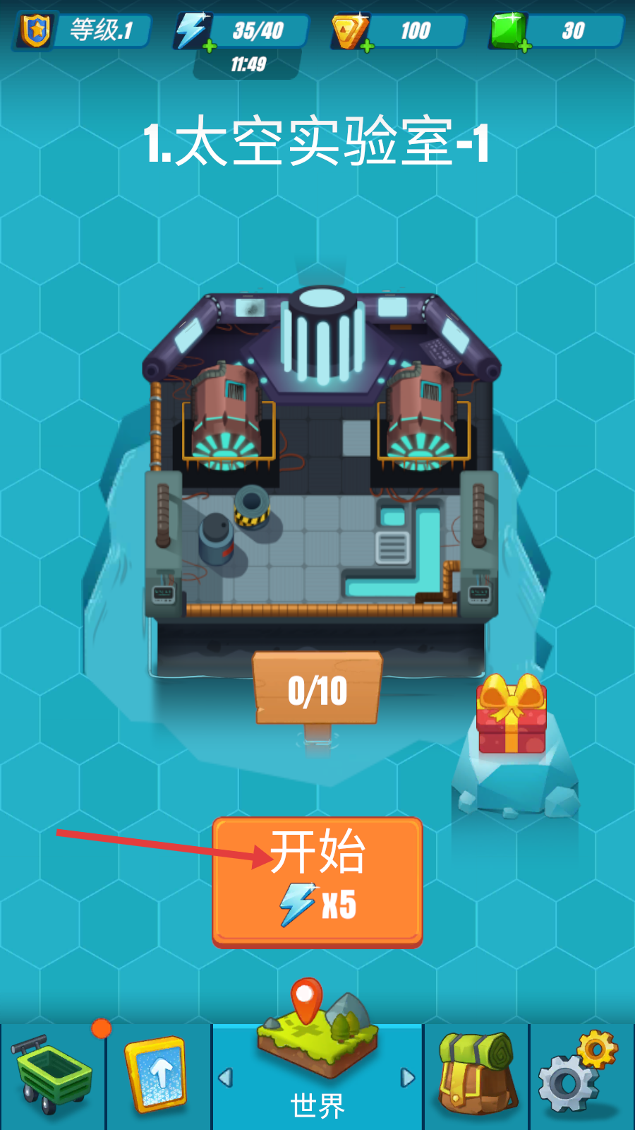 1、进入【太空实验室-1】关卡,点击【开始】按钮开启挑战,注意界面上方资源状态,为战斗做好准备。