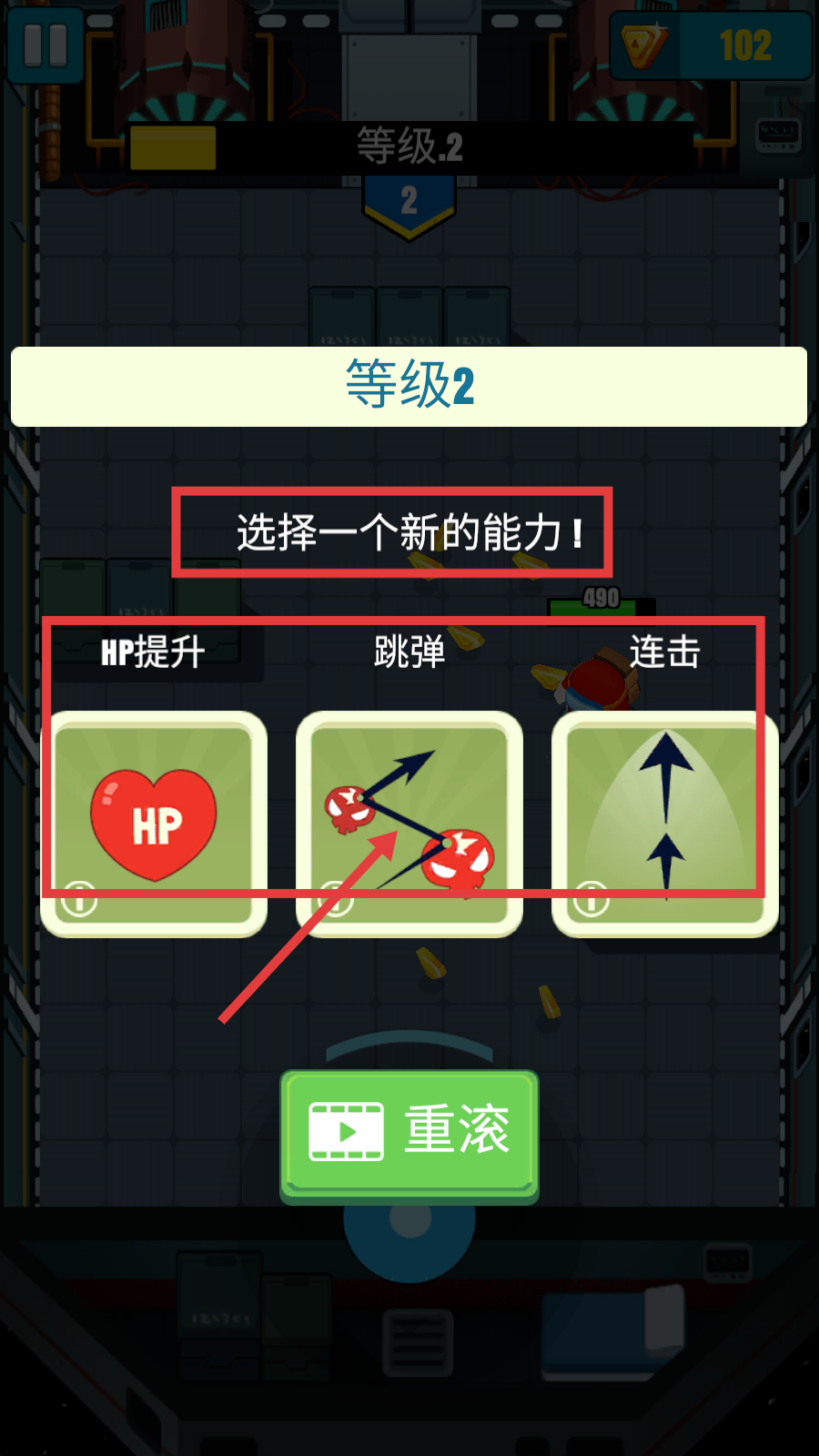 3、等级提升时会出现【选择一个新的能力】界面,推荐优先选择【跳弹】,可让攻击弹射,提升清敌效率。